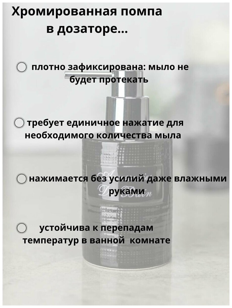 Настольный дозатор для жидкого мыла Bath Plus выполнен из керамики, которая отличается своей прочностью и устойчивостью к механическим повреждениям. Помпа из пластика хромированный, что делает дозатор стильным и современным. Емкость для мыла легко наполняется жидким мылом и не скользит на фиксаторе, что обеспечивает удобство использования и легкость ухода.Дозатор-диспенсер гармонично дополнит любой интерьер, будь то ванная комната, душевая, кухня, баня или дача. Он идеально впишется в любой дизайн и станет настоящим украшением вашего дома.Преимущества:- Прочный материал - керамика устойчива к повреждениям и истиранию, что гарантирует долгий срок службы.- Стильный дизайн - черный цвет с хромированной хромированной помпой придает дозатору современный вид.- Удобство использования - емкость для мыла легко заполняема, не скользит на фиксаторе и легко моется.- Универсальность - дозатор подходит для использования в ванной, душевой, кухне, бане и даже на даче.- Экономия - не нужно использовать мыло в неудобных упаковках, дозатор позволяет точно дозировать нужное количество мыла.- Экологичность - керамический дозатор для жидкого мыла не содержит вредных веществ и безопасен для здоровья.В целом, Надежный и стильный дозатор для жидкого мыла, который станет незаменимым помощником в уходе за вашей кожей и домом.