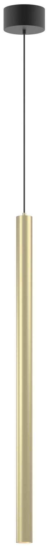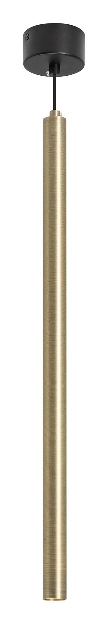 Подвесной светильник. Мощность 9 Вт, св. поток 561 лм, 64 лм/Вт, теплый 3000 K, CRI>90, угол 24°, напряжение питания 230 В. Латунный круглый корпус из алюминия, рассеиватель PC, степень защиты IP20. Размер: диаметр 30 мм, длина 600 мм, размер чаши: диаметр 80 мм, высота 40 мм. Монтаж подвесной, длина подвеса 1500 мм. Драйвер 28-42 В, 200 мА, пульсация