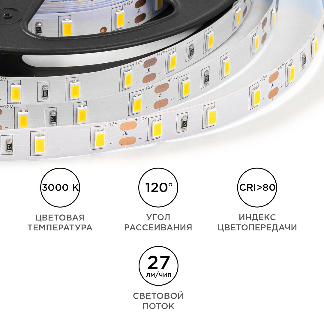 Светодиодная лента из линейки "Эконом" с артикулом работает от постоянного тока с напряжением 12В. Благодаря светодиодам smd5630, излучающим световой поток равный 27 Лм/чип, лента является прекрасным решением для организации основного освещения и ярких декоративных подсветок. Она подойдет для создания основного освещения на базе многоуровневых потолков, а также будет отличным выбором для освещения торгового оборудования или требующих большой яркости рекламных вывесок. Данная модель светодиодной ленты обладает теплым белым цветом свечения с цветовой температурой 3000 К. При выборе светодиодной ленты важно учитывать такой параметр, как потребляемая мощность, чтобы правильно подобрать блок питания. У данной модели этот показатель равен 9,6 Вт на один метр. Степень защиты этого изделия соответствует стандарту IP20, что подразумевает использование только в сухих и проветриваемых помещениях. Отрезать светодиодную ленту можно в специально отмеченных местах, которые располагаются через каждые 50 мм. Компактные размеры светодиодной ленты с шириной 10 мм и основанием из гибкой, двухслойной, медной подложки дают огромное преимущество при создании любых дизайнерских фантазий.Преимущества:- Высококачественные светодиоды San’an;- Улучшенное охлаждение благодаря двухслойной медной подложке;- Срок службы не менее 50 000 часов;- Коннекторы и провода для подключения уже напаяны на светодиодную ленту;- Простота монтажа благодаря качественному скотчу;- Экономия электроэнергии по сравнению с традиционными источниками свечения;- Комфортная цветопередача благодаря CRI>80.
