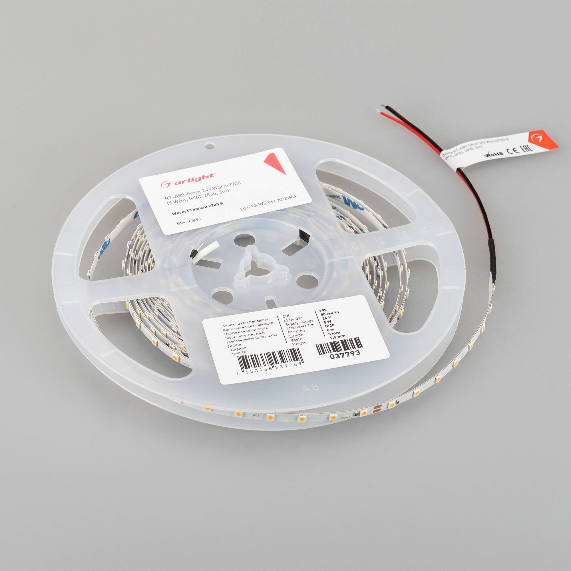 Светодиодная лента Arlight 5W/m 80LED/m 2835SMD теплый белый 5M RT-A80-5mm 24V Warm2700 / 037793