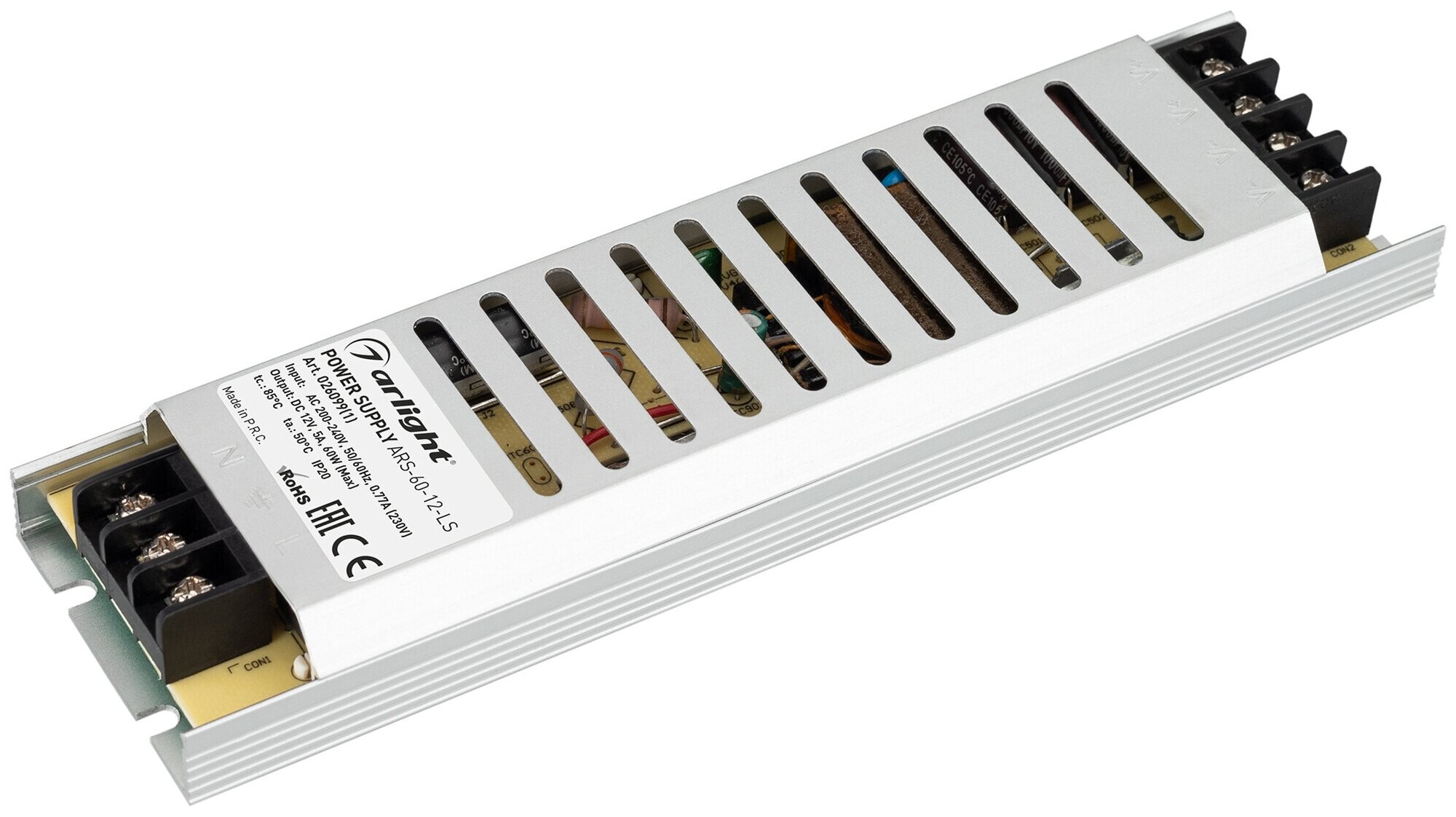 Источник напряжения с гальванической развязкой для светодиодных изделий. Входное напряжение 200-240 VAC. Выходные параметры: 12 В, 5 А, 60 Вт. Встроенный PFC >0,5. Негерметичный алюминиевый сетчатый корпус IP 20. Габаритные размеры длина 195 мм, ширина 53 мм, высота 22 мм. Гарантийный срок 2 года.