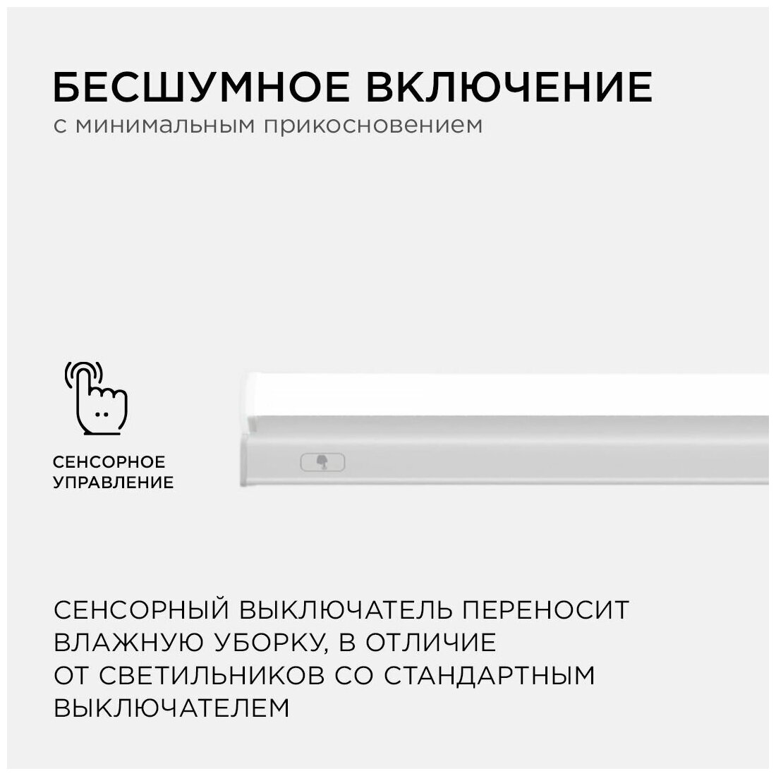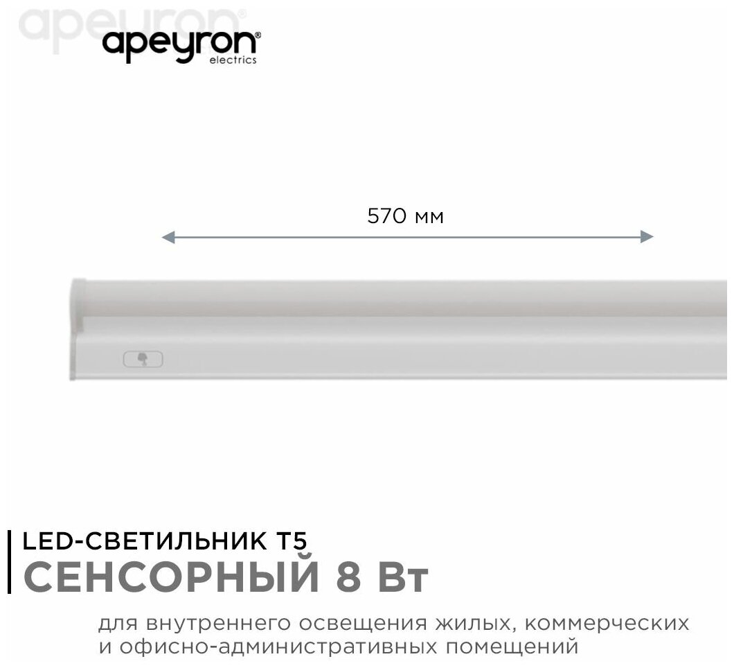 Сенсорный светодиодный светильник Т5 управляется одним касанием благодаря сенсорному выключателю. Излучает световой поток в 680 Лм, потребляя при этом 8 Вт, что является эквивалентом лампы накаливания 65 Вт. В светильнике используются светодиоды с дневным белым цветом свечения и цветовой температурой 4000 К, которая наиболее близка к естественному солнечному свету. Корпус и рассеиватель светильника сохранят свой первозданный вид и светорассеивающие качества на протяжении всего срока эксплуатации благодаря тому, что изготовлены из поликарбоната, который устойчив к воздействию температур и солнечного света. Размер светильника 570х23х35мм. Степень защиты светильника от пыли и влаги соответствует стандарту IP20, что подразумевает эксплуатацию в сухих, проветриваемых помещениях. В комплекте: сетевой шнур длиной 950 мм, коннектор для гибкого соединения длиной 150 мм и коннектор для жесткого соединения светильников, торцевая заглушка, крепежные элементы для фиксации в накладном варианте. Количество светильников, которые можно соединить последовательно, 9 шт. Благодаря надежному драйверу светодиоды защищены от скачков напряжения, а сам светильник сохраняет равномерное свечение. Работает от сети с напряжением 230 В. Преимущества: - TOUCH сенсор: управление одним касанием; - Возможность соединения светильников в линию; - Всё включено: максимальная комплектация; - Подходит для подсветки рабочих зон на кухне, ниш, шкафов, гардеробных, стеллажей и торговых витрин; - Сохранит свой первозданный вид благодаря корпусу и рассеивателю из поликарбоната; - Безопасен для глаз благодаря пульсации