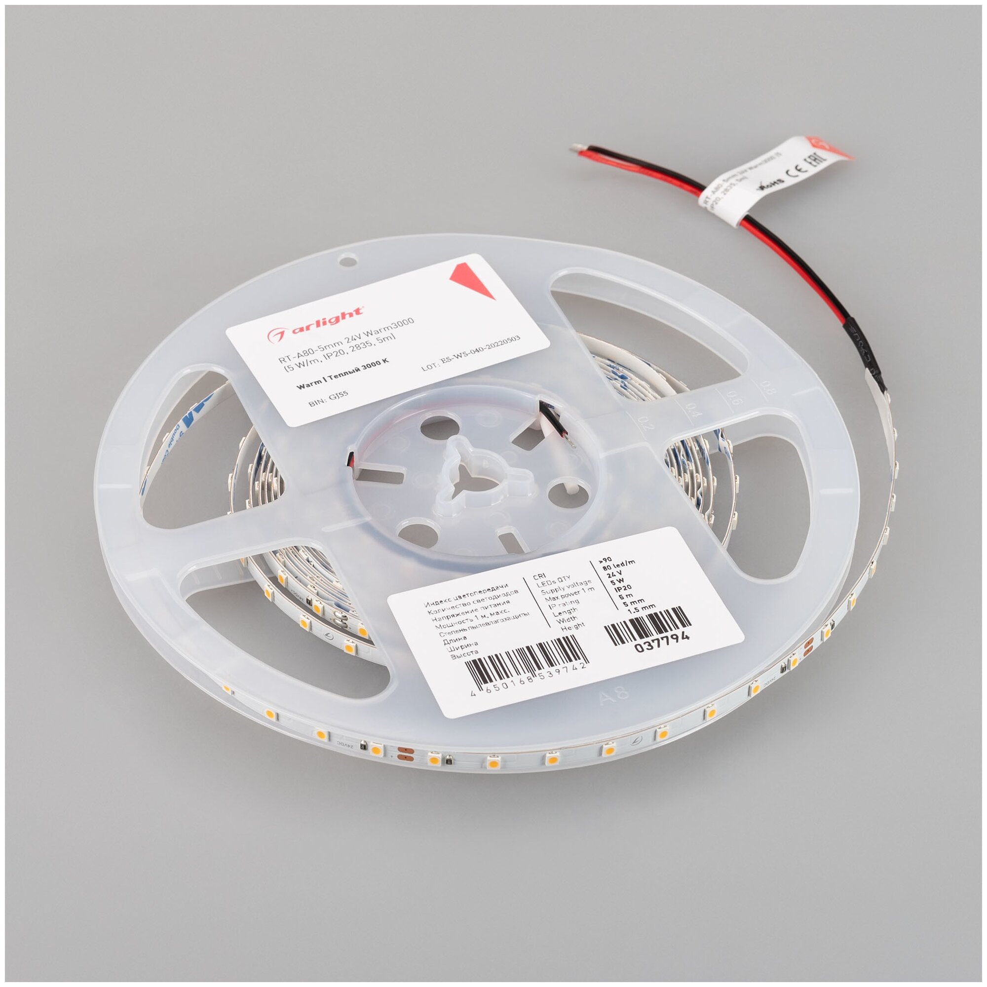 Светодиодная лента Arlight 5W/m 80LED/m 2835SMD теплый белый 5M RT-A80-5mm 24V Warm3000 / 037794