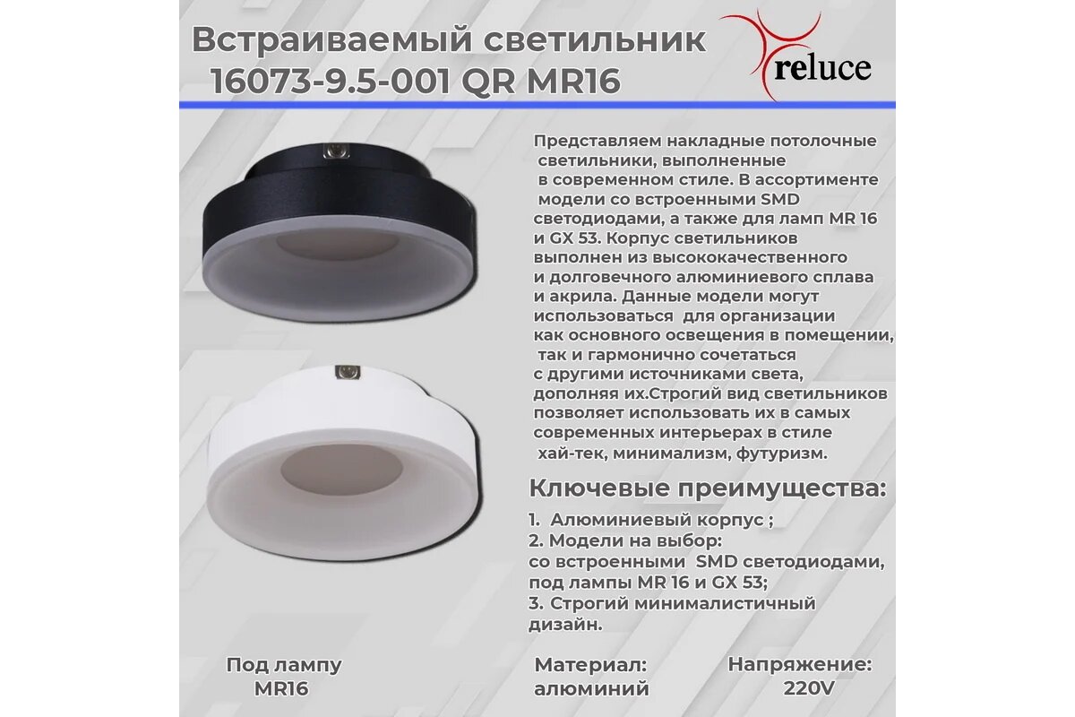 Сервис сравнения цен СкидкаГИД предлагает сравнить цены на товар «Точечный светильник Reluce 16073-9.5-001QR MR16 BK»