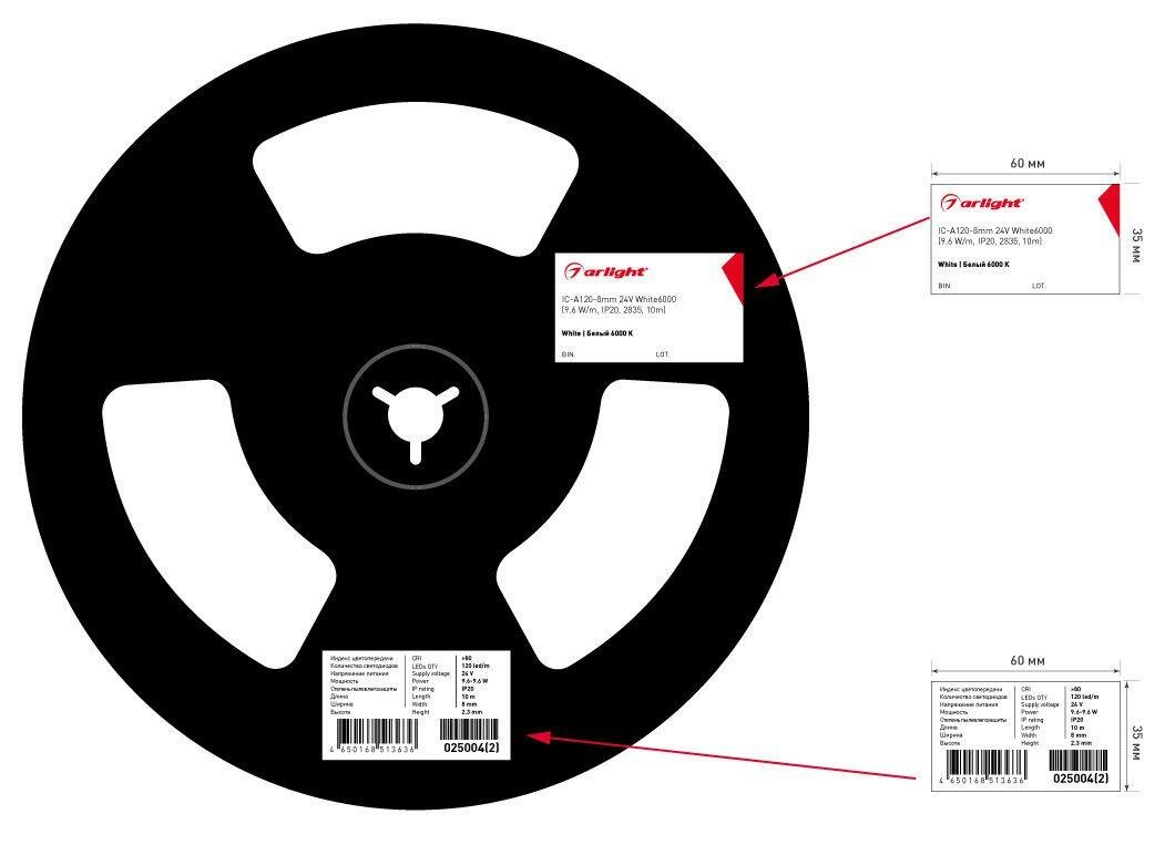 Светодиодная лента IC-A120, открытая IP20. Светодиоды 2835, 120 шт/м (1200 шт на 10 м), белая плата, ширина 8 мм, скотч 3M. Цвет ДНЕВНОЙ 4000 K, цветопередача CRI>80, угол 120°. Питание 24 В, мощность 9.6 Вт/м (96 Вт на 10 м). Размеры 10000x8x1.3 мм. Мин. отрезок 50 мм, 6 светодиодов. Цена за 1 м.