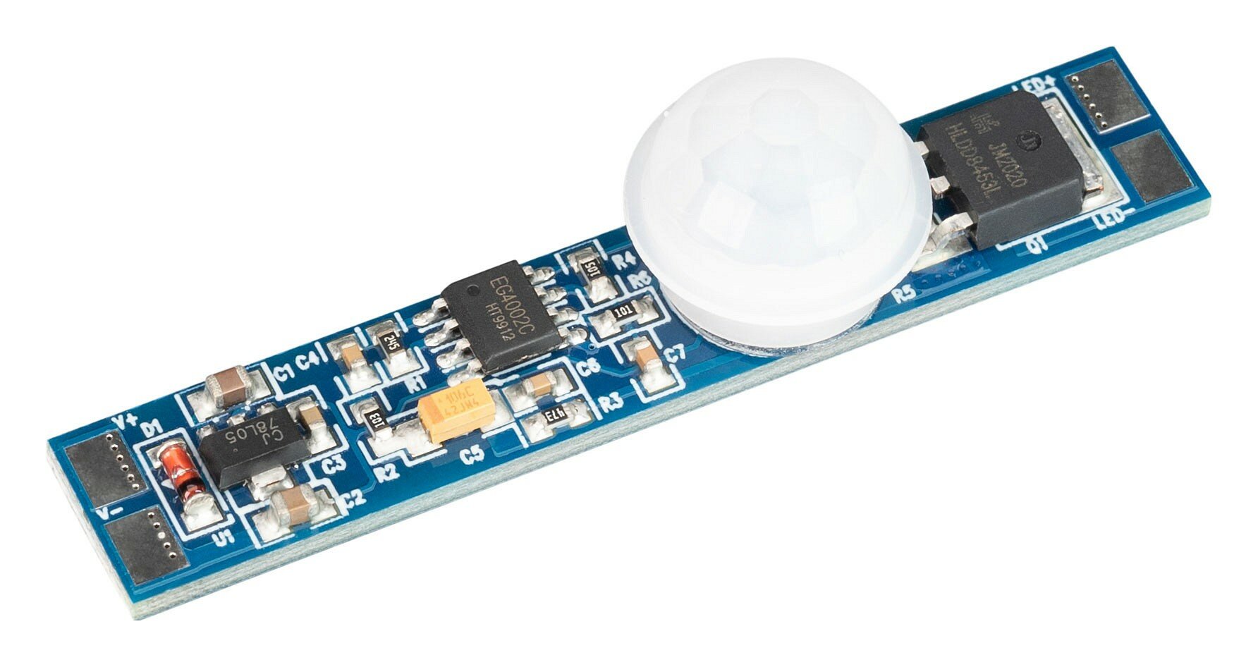 ИК-выключатель, встраиваемый в профиль, реагирует на движение. При улавливании движения - включение и выключение света. При пропадании движения - отключение света через ~40сек. Зона срабатывания до 2 м. Требуется вырез в экране профиля для работы датчика Ø 12.3 мм. Для профилей с внутренней высотой (пов. профиля - пов. экрана) от 10 до 20 мм. 12-24V, 2.5A. Размер платы 55x10x14мм, размер датчика: D12х10мм.