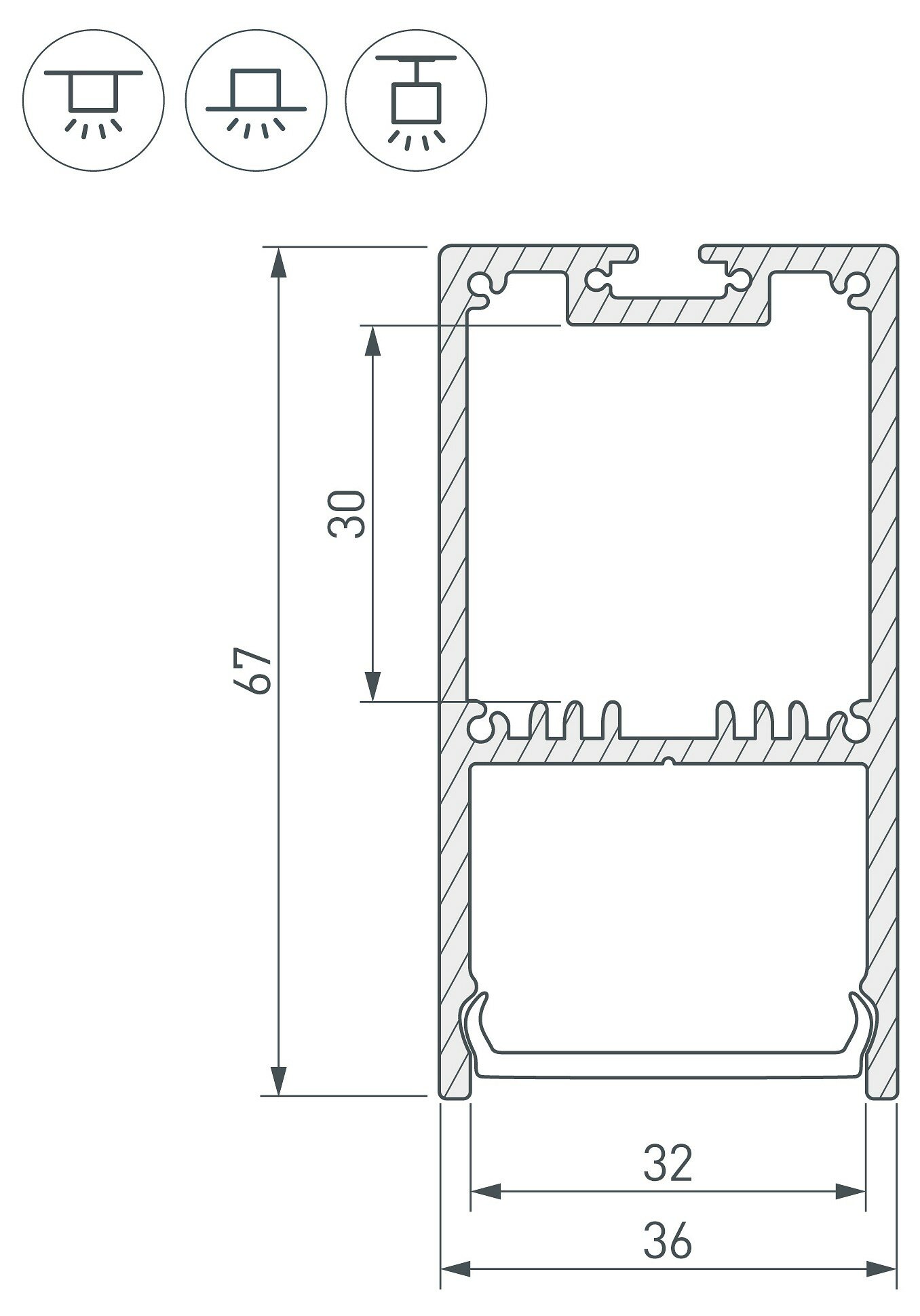 Подвесной/накладной/встраиваемый профиль белого цвета из алюминия с отсеком для блока питания (30х32 мм) в комплекте с матовым рассеивателем из поликарбоната со светопропусканием 67% и заглушками идеально подходит для основного освещения и контурной подсветки. Габаритные размеры профиля составляют 2500 мм в длину, 36 мм в ширину и 67 мм в высоту. Площадка для установки светодиодных лент позволяет использовать ленту шириной до 32 мм и мощностью до 54 Вт/м. Это обеспечивает гибкость в выборе светодиодных лент и создает потрясающие световые решения. Отличное решение для создания современных световых проектов.