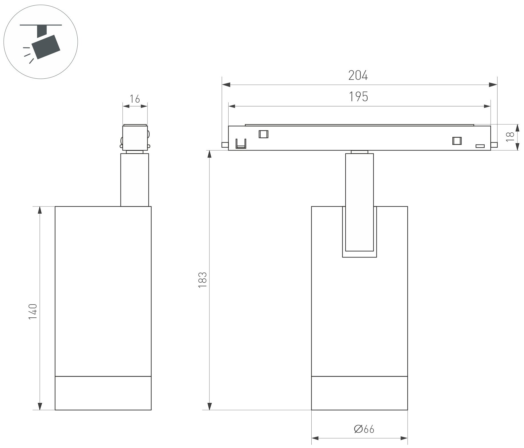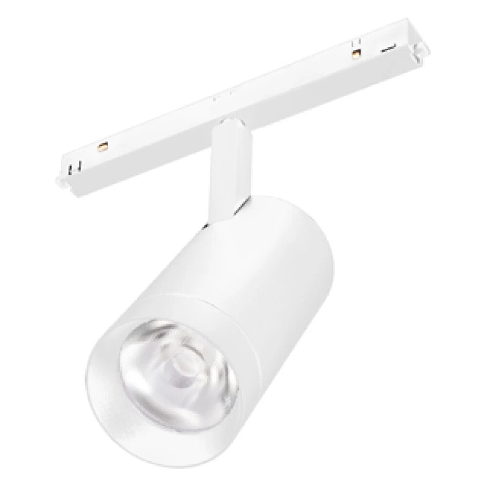 Светильник для магнитных треков MAG-ORIENT шириной 26 мм. Мощность 20 Вт, св. поток 2010 лм, 100 лм/Вт, дневной 4000 K, CRI>90, угол 24°, напряжение питания 48 В. Белый фигурный корпус из металл, экран поликарбонат, степень защиты IP20. Размеры LxWxH 116x66x198 мм. Длина светоизлучающего модуля 140мм. Монтаж на трек MAG-ORIENT. Пульсация