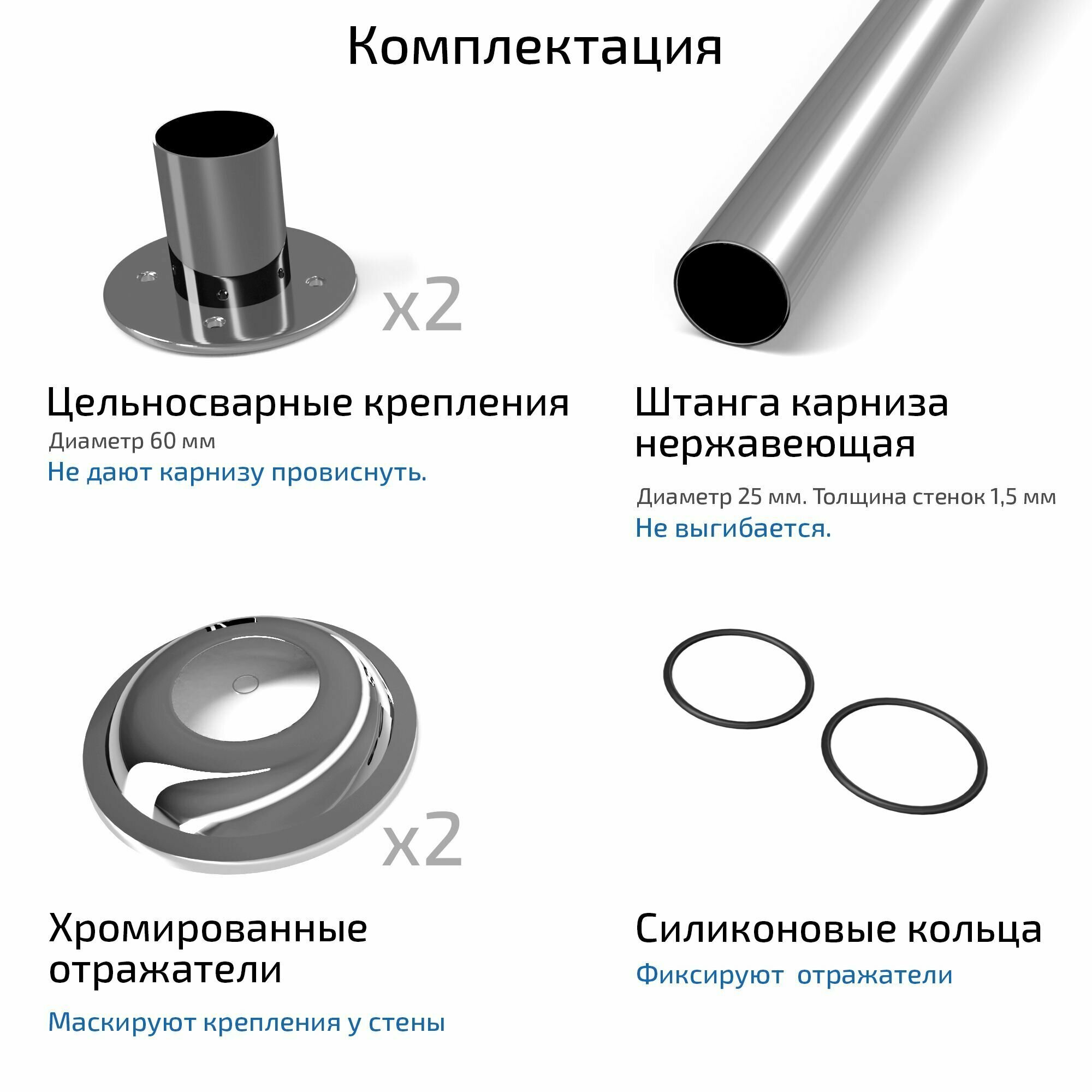 Карниз для ванной бренда "Triton" изготовлен из нержавеющей стали, отлично переносит высокую влажность и резкие перепады температуры, надежно защищен от коррозии. Толщина стенок 1,5 мм, выдерживает нагрузку более 25 кг, что позволяет избежать прогиба штанги, потолочное крепление не требуется. Вы получаете полный комплект для установки с саморезами. Универсальный цвет карниза будет сочетаться со шторами любого оттенка и цветовой гаммы, так же подойдет для любого стиля и дизайна вашей ванной комнаты.