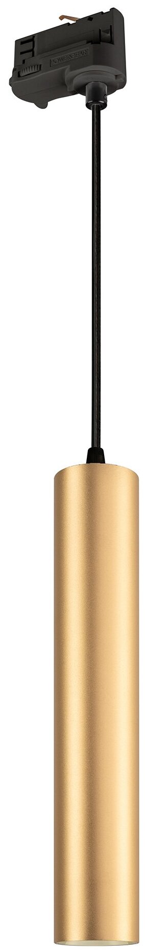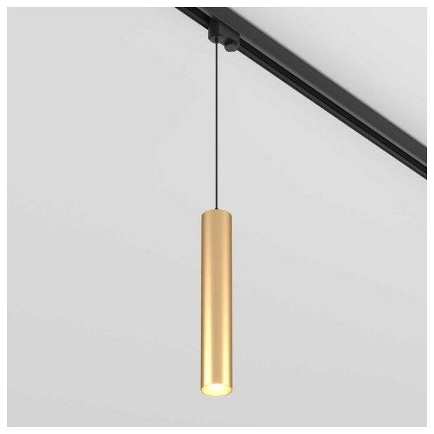 Светильник подвесной для треков/шин 4 провода. Мощность 9 Вт, св. поток 825 лм, 93 лм/Вт, теплый 3000 K, CRI>90, угол 40°, напряжение питания 230 В. Золотой корпус из алюминия, материал рассеивателя PC, степень защиты IP20. Размер: диаметр 50 мм, длина 310 мм, длина подвеса 1500 мм. Монтаж на трек 3-фазный. Драйвер 30-45 В, 220 мА, пульсация