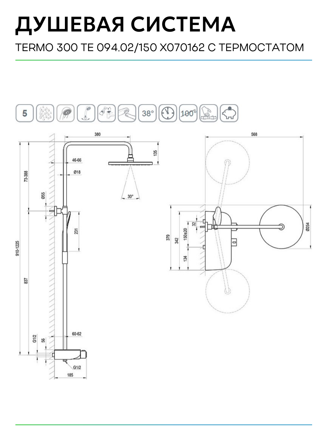 - Механизм: термостатический картридж для контроля температуры воды.