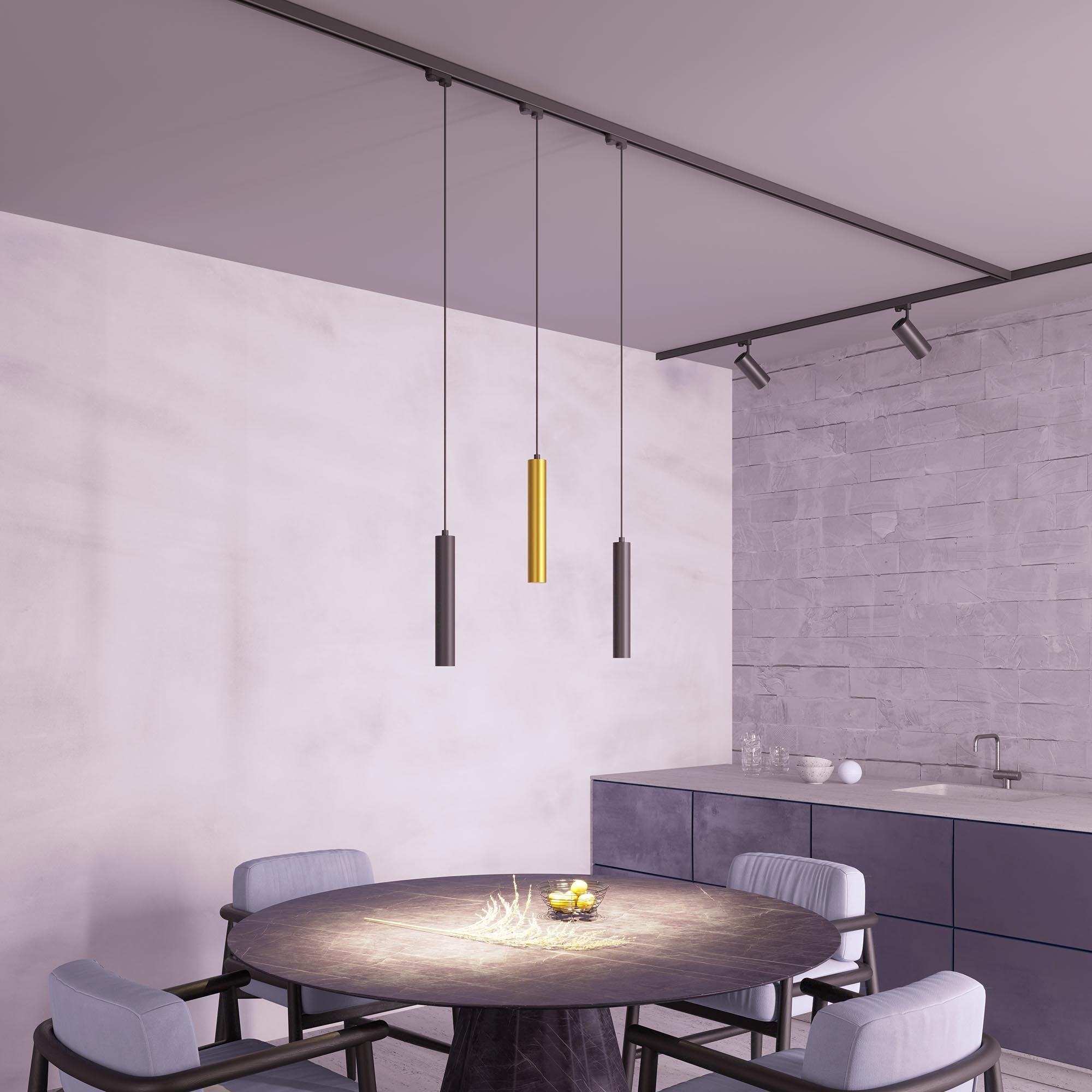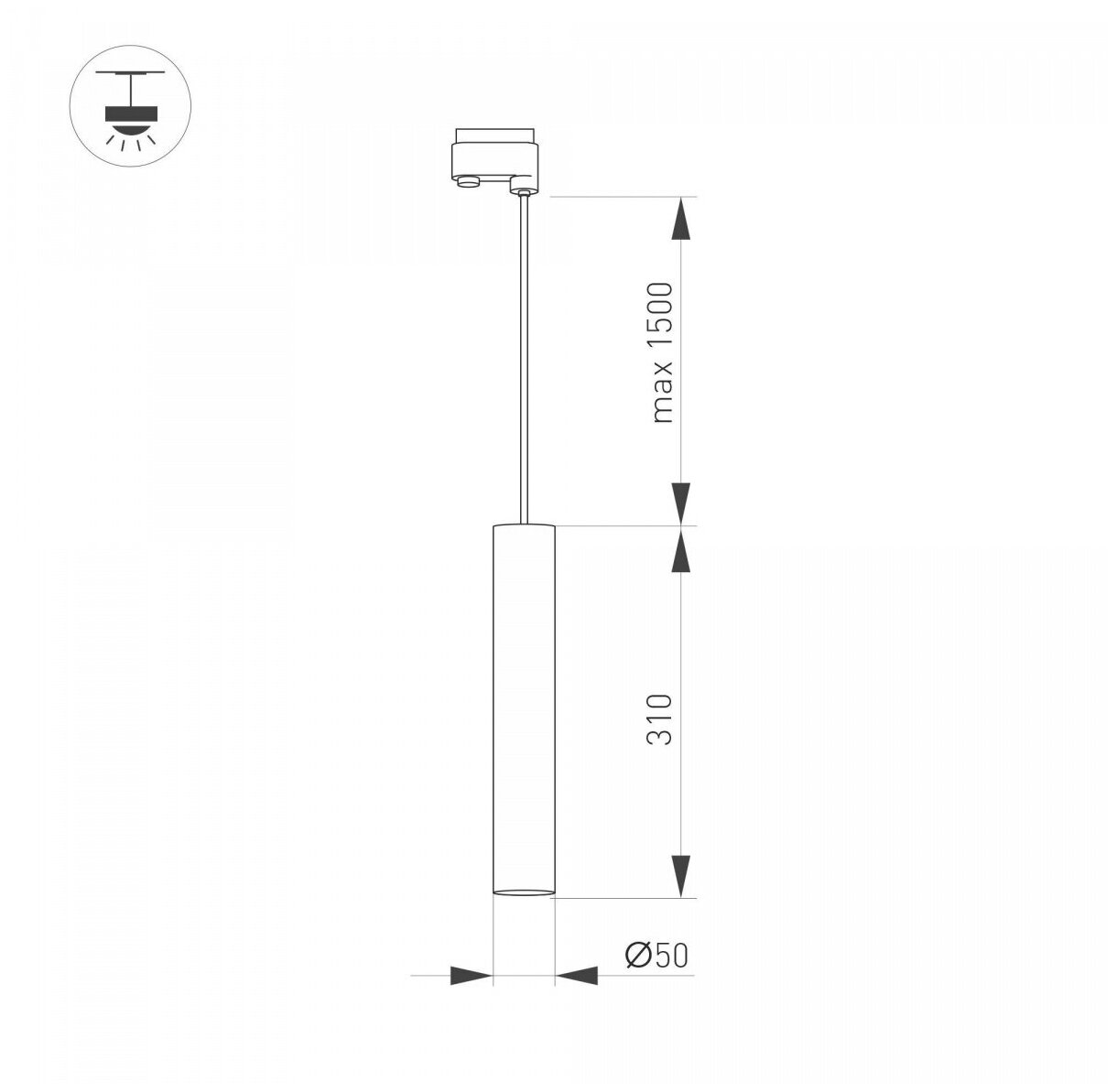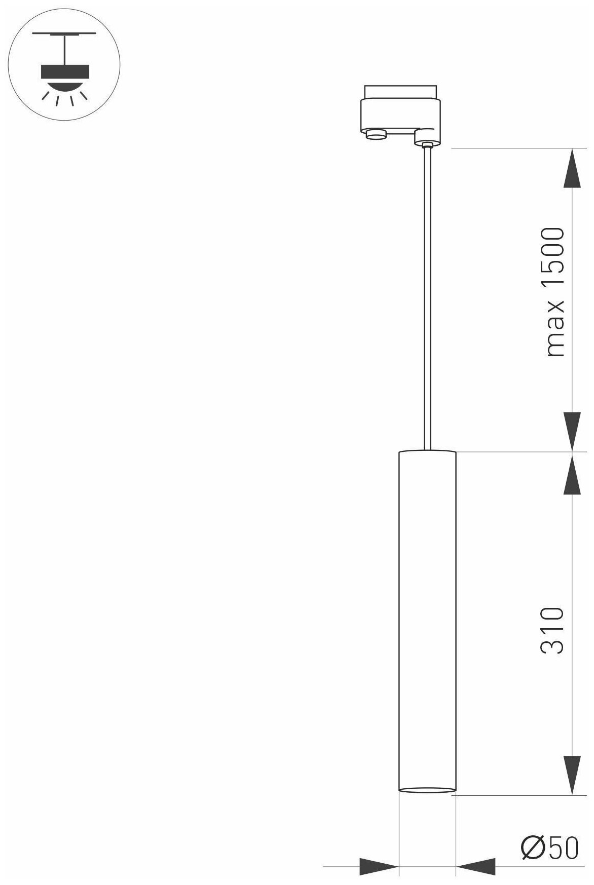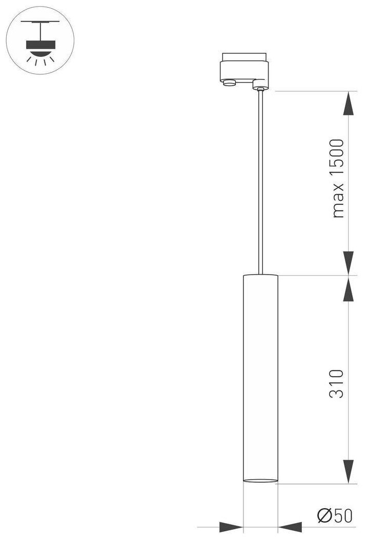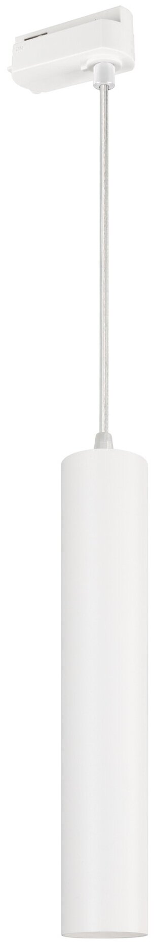Светильник подвесной для треков/шин 2 провода. Мощность 9 Вт, св. поток 825 лм, 93 лм/Вт, теплый 3000 K, CRI>90, угол 40°, напряжение питания 230 В. Белый корпус из алюминия, материал рассеивателя PC, степень защиты IP20. Размер: диаметр 50 мм, длина 310 мм, длина подвеса 1500 мм. Монтаж на трек 1-фазный. Драйвер 30-45 В, 220 мА, пульсация