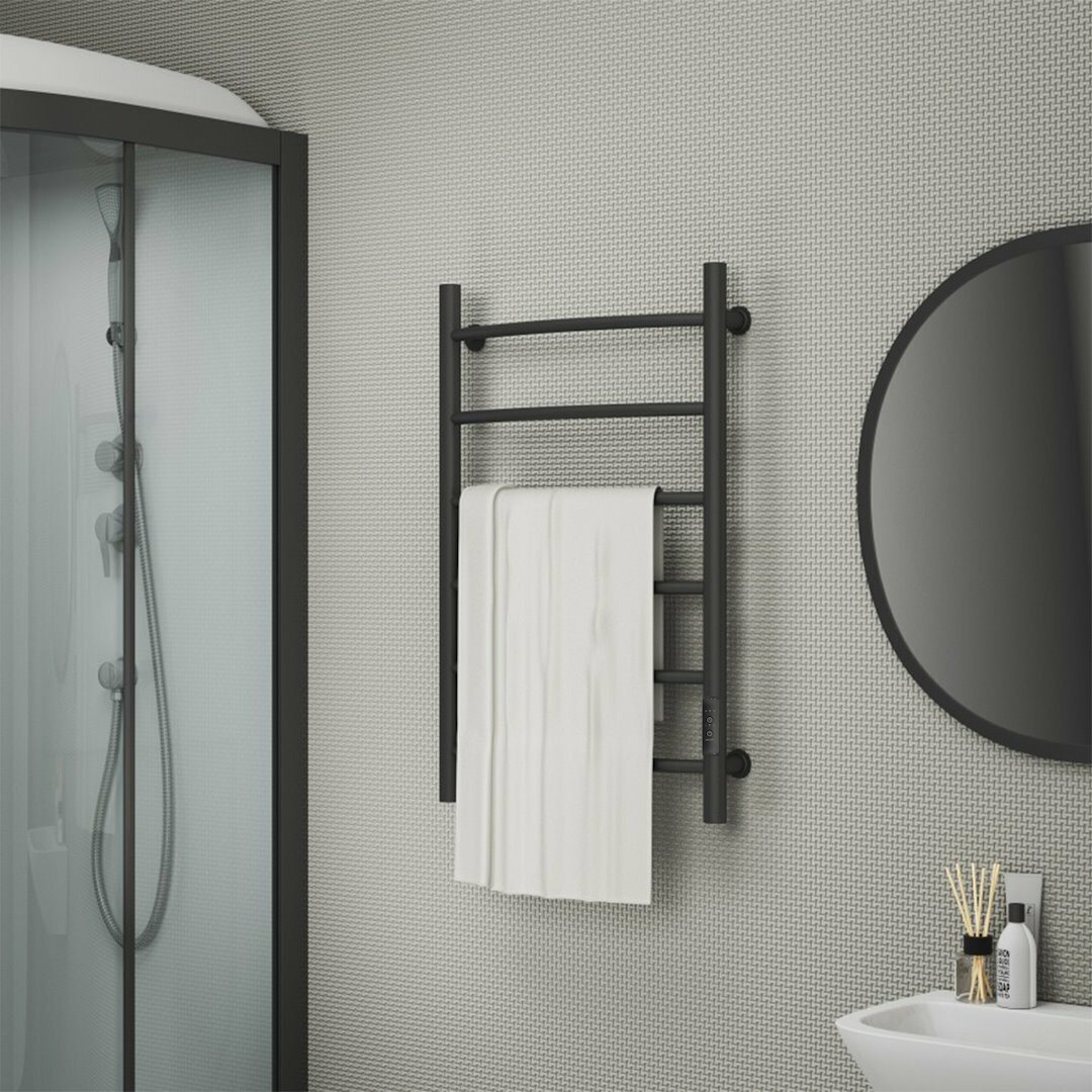 Полотенцесушитель электрический Маргроид Лина (ВхШ) 80х50, П6 - идеально решение для обустройства комфортной ванной комнаты. Стильный радиатор, выполненный в матовом черном цвете, станет украшением вашего интерьера. Изделие изготовлено из высококачественной стали и имеет износостойкое покрытие, гарантирующее долгий срок службы прибора.Удобная конструкция представляет собой классическую лесенку с шестью перекладинами. Практичные и продуманные размеры 50 х 10 х 80 см - позволят разместить полотенцесушитель Маргроид Лина (ВхШ) 80х50, П6 даже в небольшом санузле.Изделие питается от стандартной бытовой сети 220 вольт и имеет два способа подключения на выбор. Установить прибор можно подключив полотенцесушитель напрямую к вашей электросети при помощи идущего в комплекте набора для скрытого монтажа или стандартным методом подключения в розетку, при помощи вилки и шнура.Устройство имеет встроенную функцию регулировки температуры, три режима нагрева и таймер. Управление осуществляется при помощи удобной панели, размещенной на правой стороне полотенцесушителя.