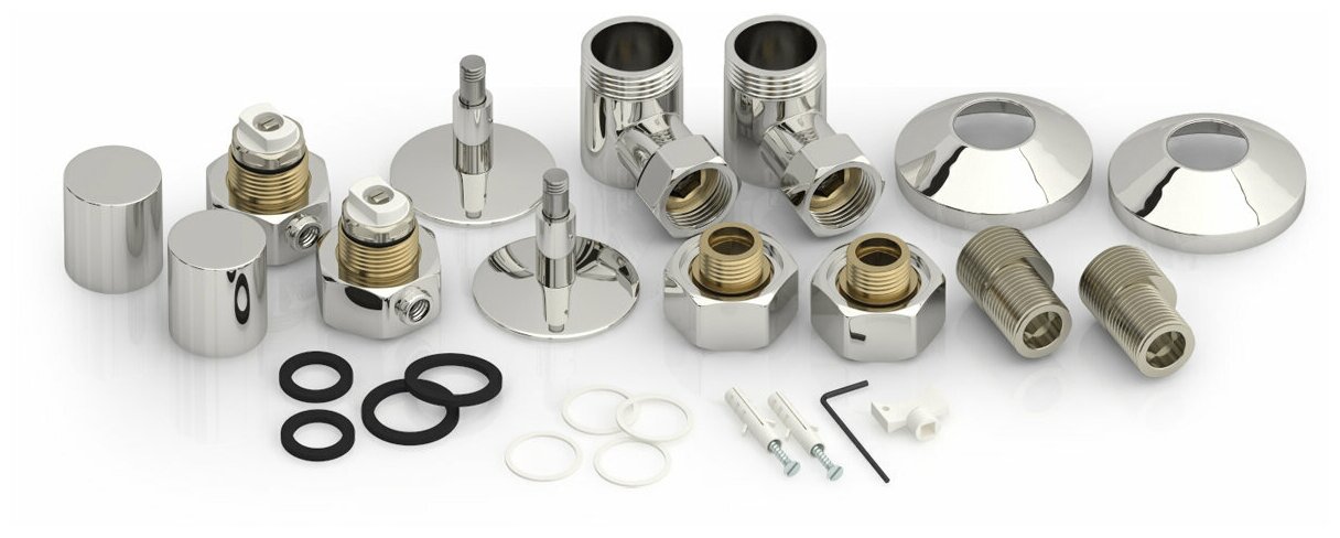 Полный комплект для водяного подключения полотенцесушителя через угловые элементы с узлами для сброса воздуха.