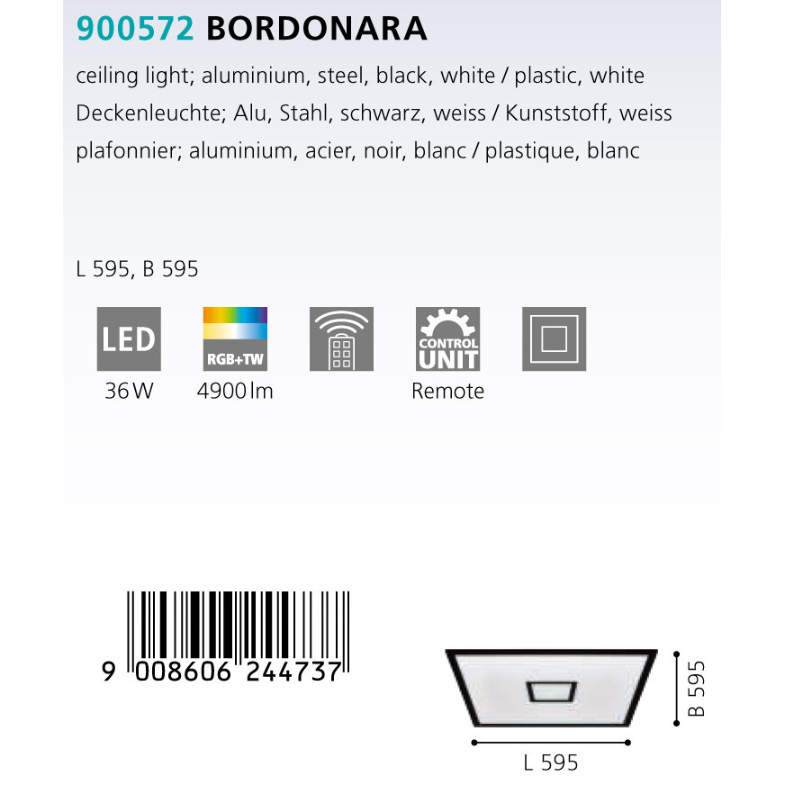 | Номенклатура | 900572 Потолочный светильник диммируемый с пультом BORDONARA, 36W (LED), 3000-6000K, L595, B595, алюминий, сталь, черный, белый / пластик, белый |