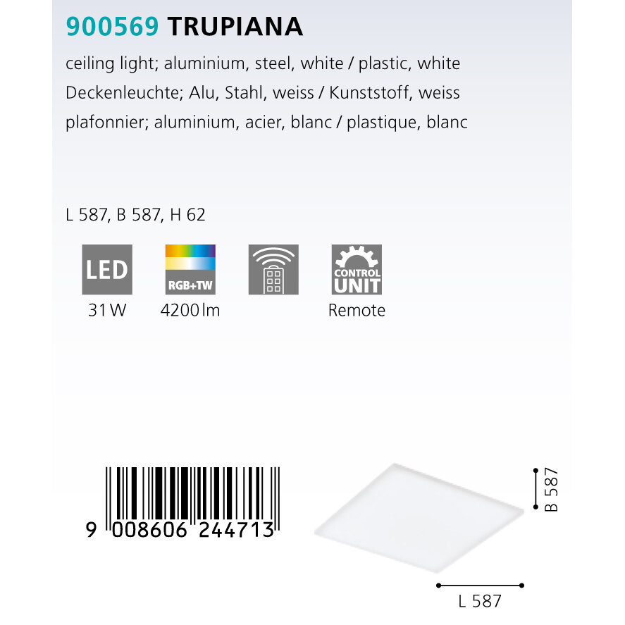 | Номенклатура | 900569 Потолочный светильник диммируемый с пультом TRUPIANA, 33,5W (LED), 3000-6500K, L587, B587, H62, алюминий, сталь, белый / пластик, белый |