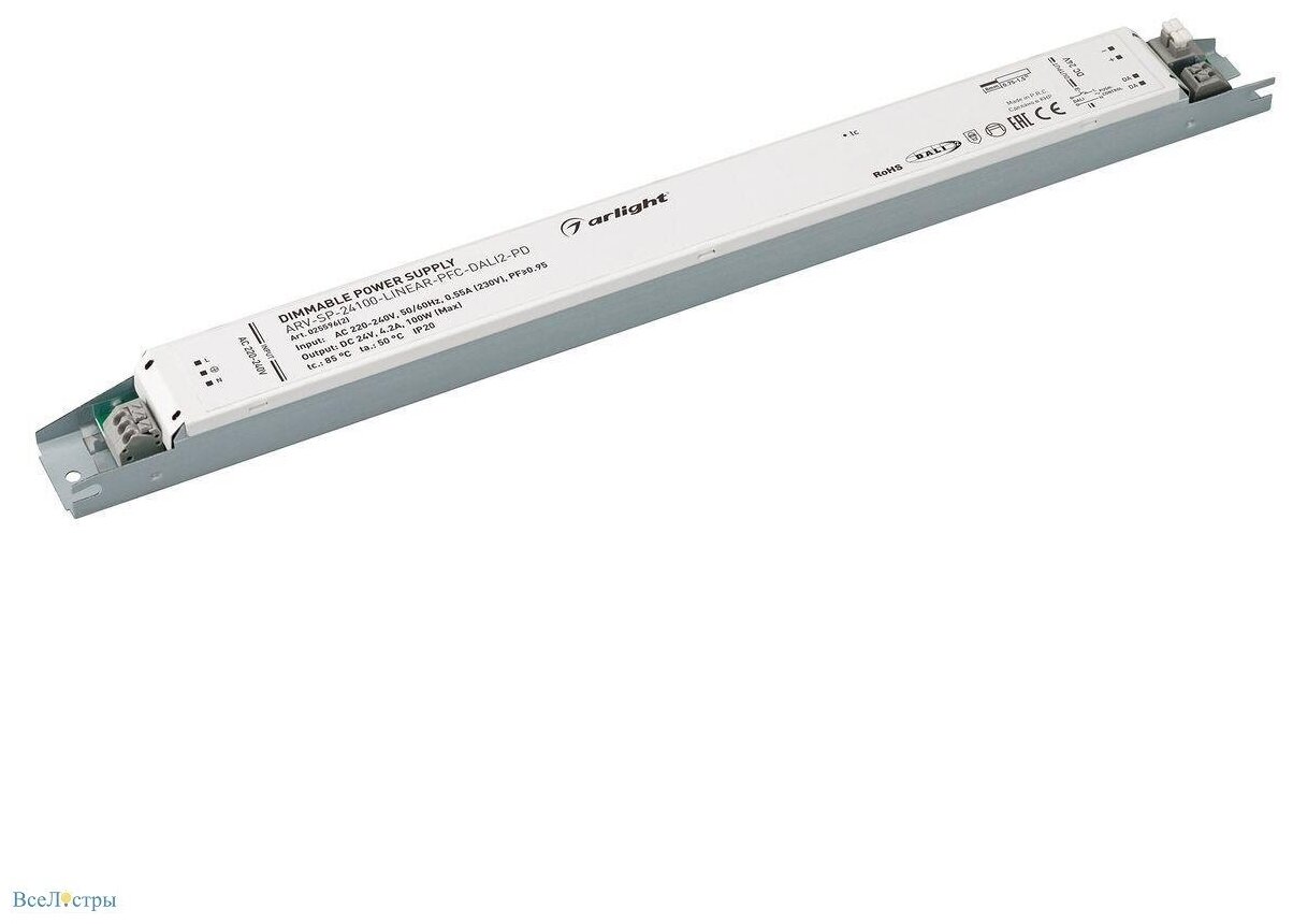 Диммируемый источник напряжения по протоколу DALI 2.0 и функцией PUSH DIM с гальванической развязкой для светодиодных изделий. Входное напряжение 220-240 VAC. Выходные параметры: 24 В, 4,2 А, 100 Вт. Встроенный PFC >0,95. Негерметичный алюминиевый корпус IP 20.Габаритные размеры длина 360 мм, ширина 30 мм, высота 21 мм. Гарантийный срок 5 лет.