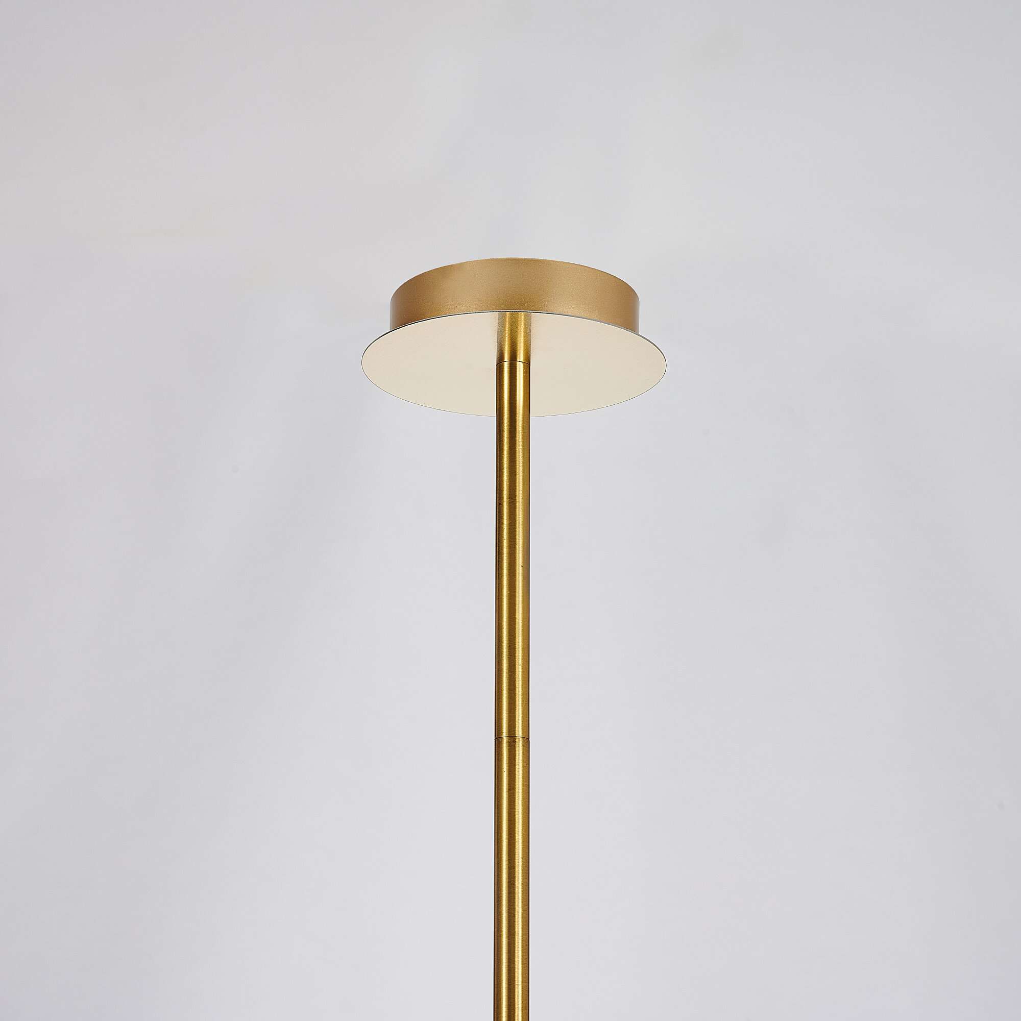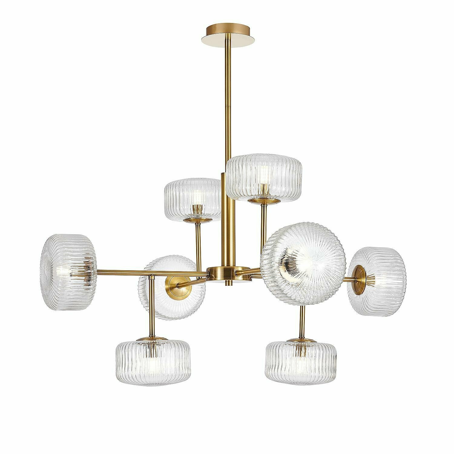 Люстра выполнена в современном стиле и имеет латунный цвет арматуры и прозрачный стеклянный плафон. Арматура изготовлена из металла, а плафон - из стекла.