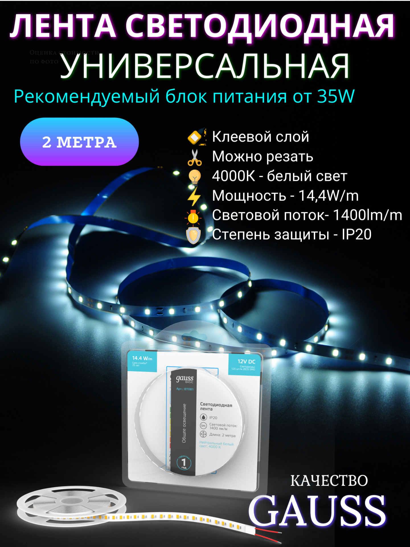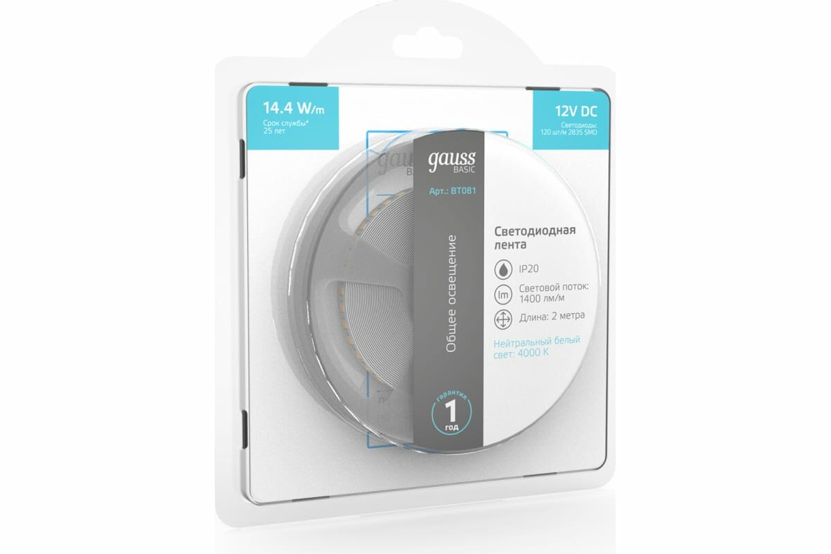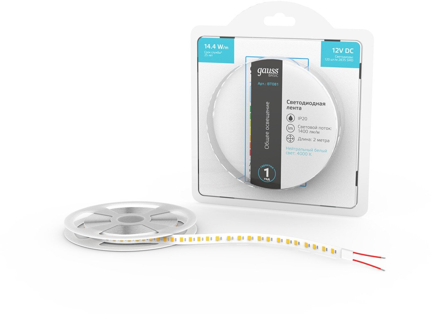 Светодиодная лента Gauss 144W/m 120LED/m 2835SMD нейтральный белый 3M BT083