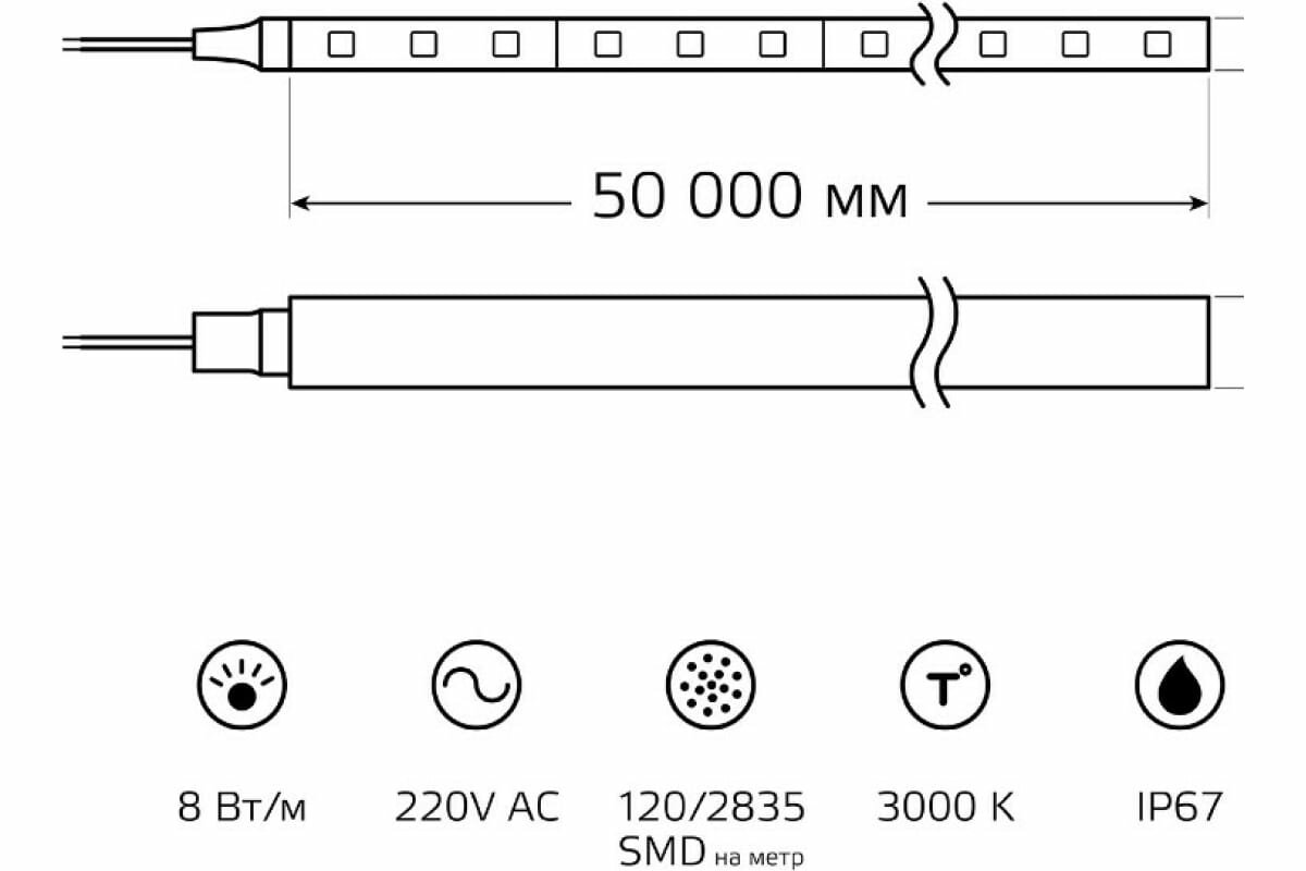 Лента Gauss LED 2835/120-SMD 8W 220V 200lm/m 6000K NEON 8x16мм IP67 50м 311000308 - прекрасное решение для создания эффектной рекламы, подсветки зданий или интерьеров. Основным преимуществом гибкого неона является равномерность свечения. Рассеиватель равномерно распределяет световой поток по всей длине ленты, делая его непрерывным, тем самым достигается эффект "неона". Лента обладает высокой степенью защиты от внешних факторов. Наименьший радиус изгиба позволяет создавать вывески, фигуры, надписи любых форм и размеров.
