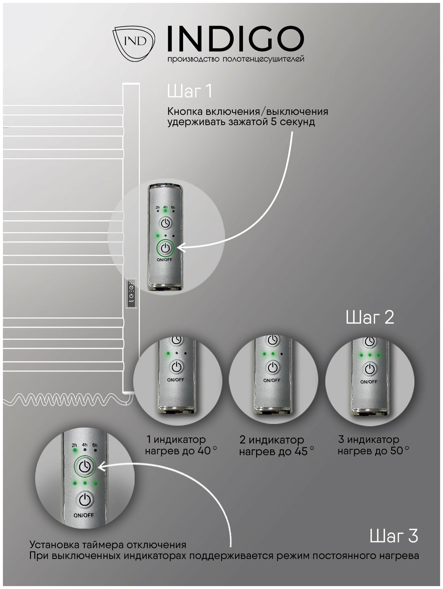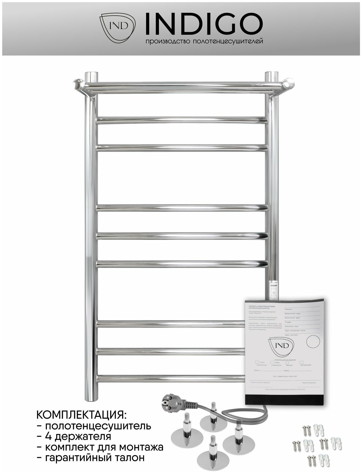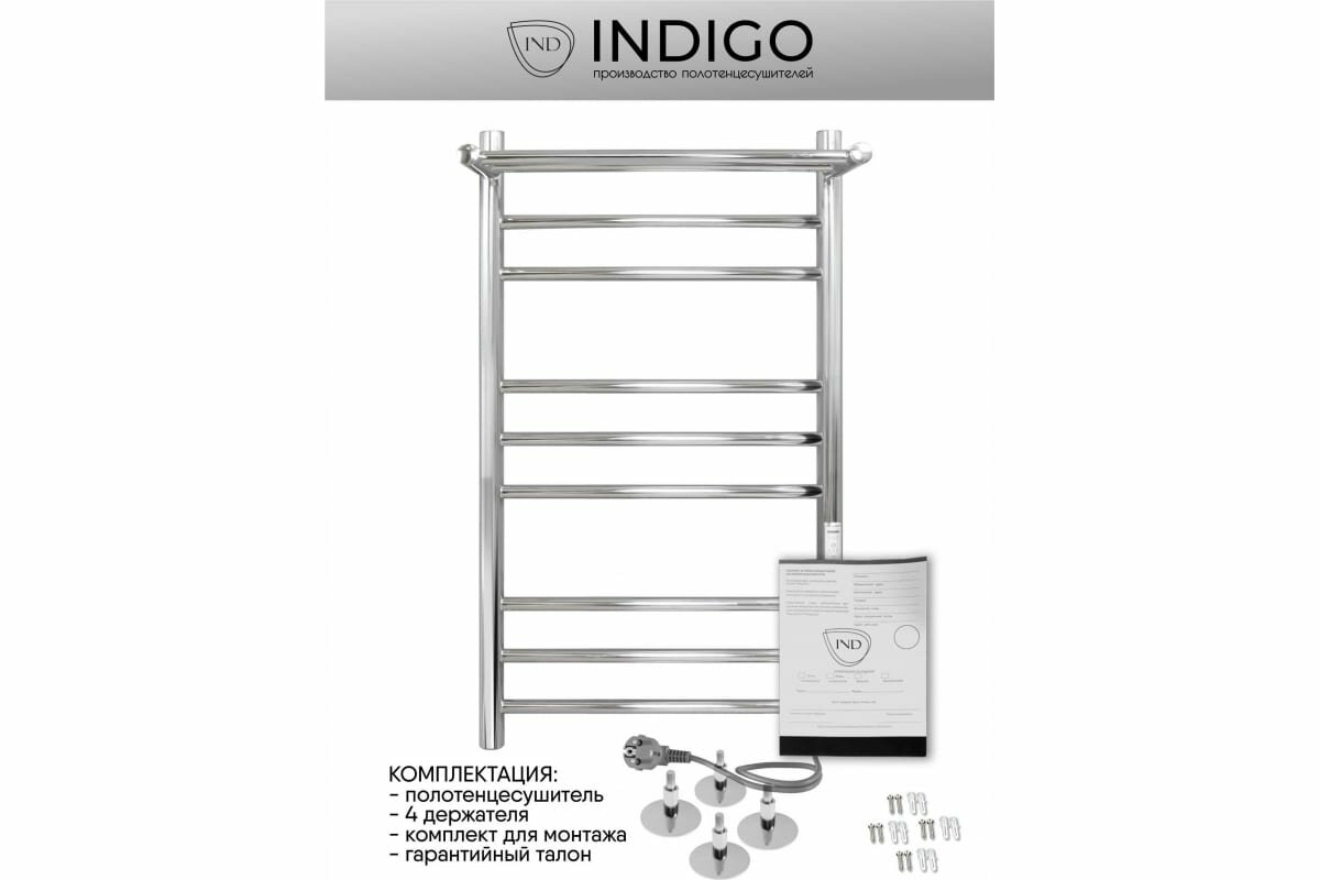 Полотенцесушитель электрический INDIGO Trinity с полкой в размере 800х500 (ВхШ) выбирают за его технологичность и универсальность. Модель имеет терморегулятор нагрева, у которого три режима: 40, 45, 50 градусов и таймер на отключение через 2, 4, 6 часов. Универсальность изделия предусматривает подключение через прямой провод, который переставляется на нужную вам сторону или скрытое подключение без покупки дополнительного переходника. Длина прямого провода 1,2 метра. Полотенцесушитель относится к энергоэффективным изделиям, потребляемая мощность в данном размере 115 Вт. Специальная технология нагревательного кабеля защищает полотенцесушитель от перегрева что влияет на длительные сроки службы. В комплектации идут 4 телескопических держателя, комплект монтажа и гарантийный паспорт.Полотенцесушитель INDIGO Trinity застрахован и имеет гарантию 3 года. Выбирая INDIGO вы получаете надежный продукт из нержавеющей стали с гарантией качества от Российского производителя