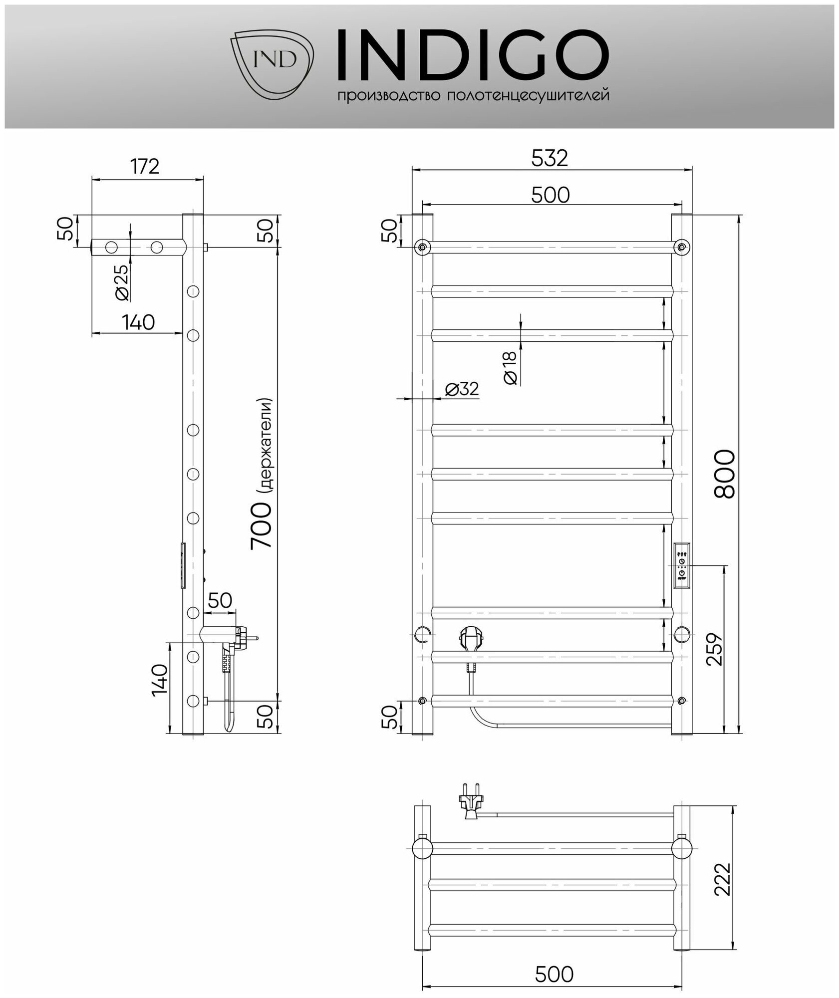 Полотенцесушитель электрический INDIGO Trinity с полкой в размере 800х500 (ВхШ) выбирают за его технологичность и универсальность. Модель имеет терморегулятор нагрева, у которого три режима: 40, 45, 50 градусов и таймер на отключение через 2, 4, 6 часов. Универсальность изделия предусматривает подключение через прямой провод, который переставляется на нужную вам сторону или скрытое подключение без покупки дополнительного переходника. Длина прямого провода 1,2 метра. Изделие окрашено порошковой краской по специальной технологии.Полотенцесушитель относится к энергоэффективным изделиям, потребляемая мощность в данном размере 120 Вт. Специальная технология нагревательного кабеля защищает полотенцесушитель от перегрева что влияет на длительные сроки службы. Изделие окрашено порошковой краской по специальной технологии. В комплектации идут 4 телескопических держателя, комплект монтажа и гарантийный паспорт.Полотенцесушитель INDIGO Trinity застрахован и имеет гарантию 3 года. Выбирая INDIGO вы получаете надежный продукт из нержавеющей стали с гарантией качества от Российского производителя