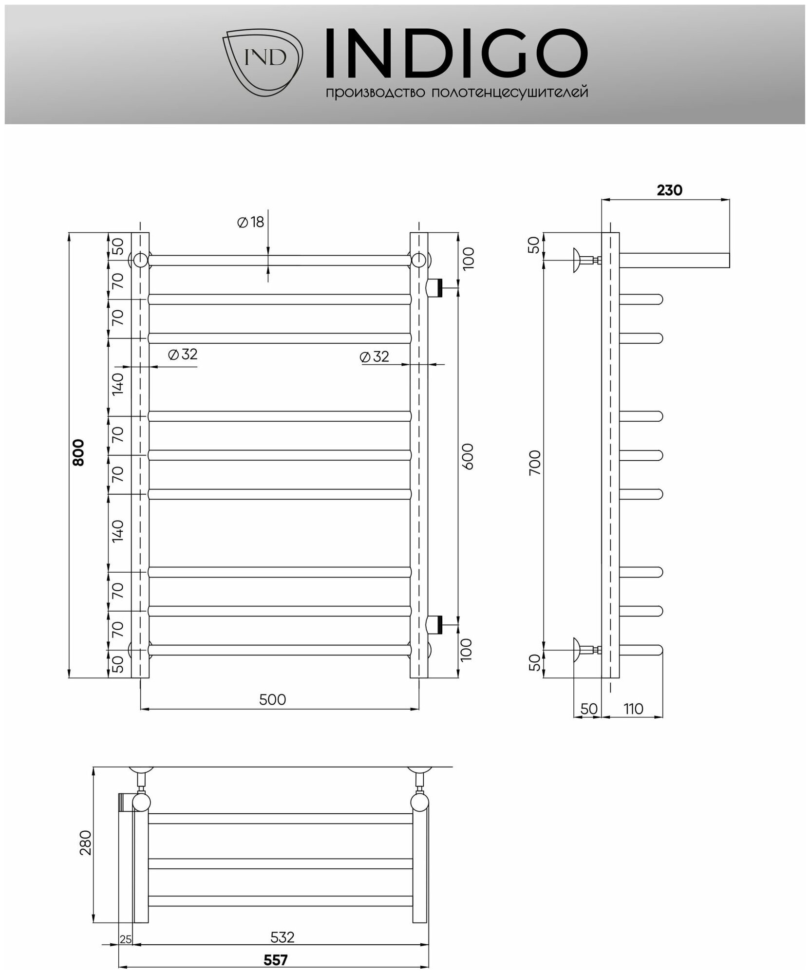 Полотенцесушитель водяной INDIGO Brace с полкой с боковым подключением в размере 800х500 (ВхШ) выбирают за его скобообразные перекладины и функциональность. Модель изготовлена из высококачественной нержавеющей стали. Качественная металлообработка в местах подключений обеспечивает плотное прилегание прокладки. Изделие окрашено порошковой краской по специальной технологии. В комплектацию входит изделие, гарантийный талон, держатели 4 шт. Для монтажа необходимо отдельно приобрести нужные вам фитинги. Полотенцесушитель INDIGO Brace застрахован и имеет гарантию 5 лет.Выбирая INDIGO, вы получаете надежный продукт из нержавеющей стали с гарантией качества от Российского производителя.