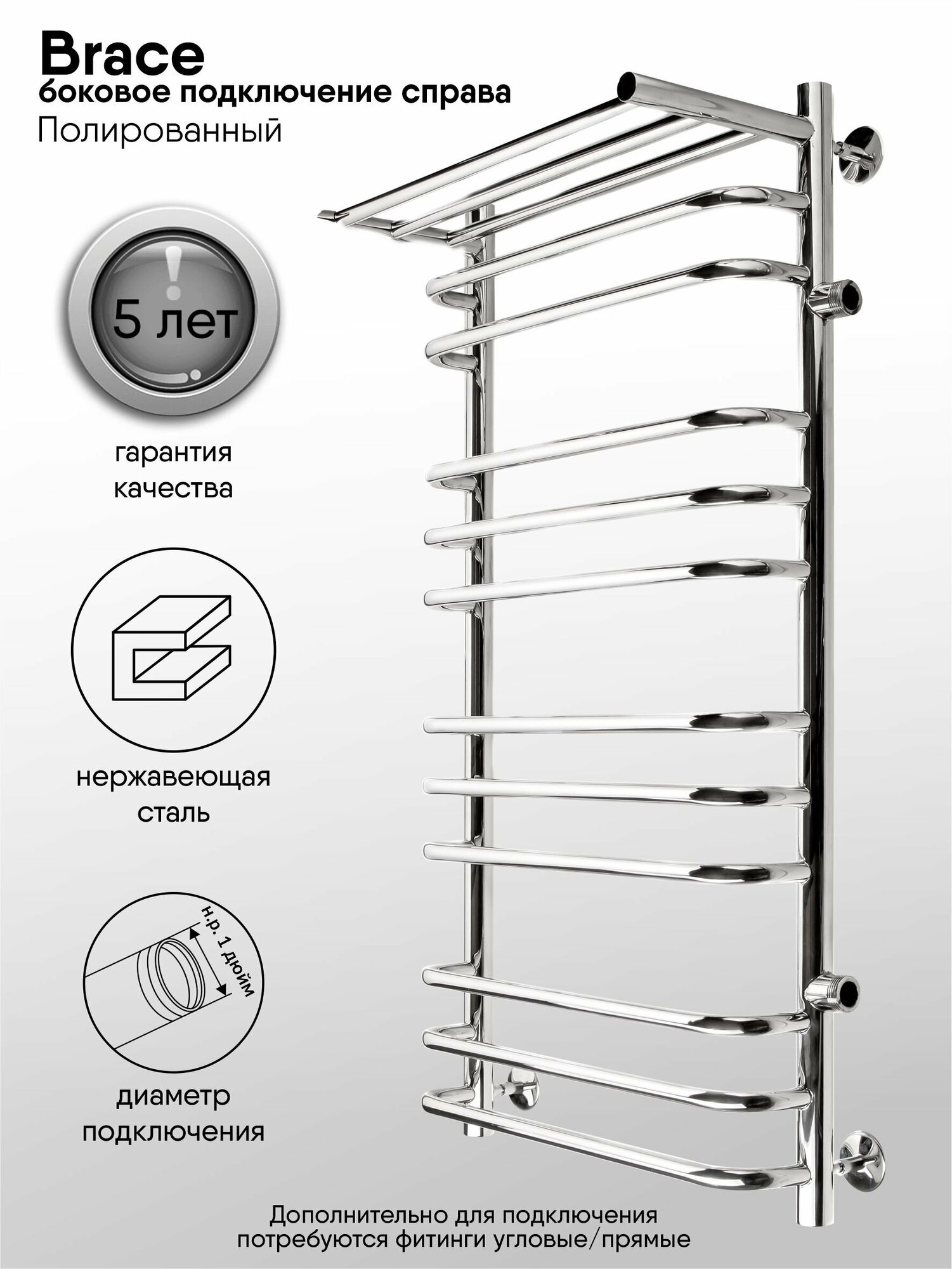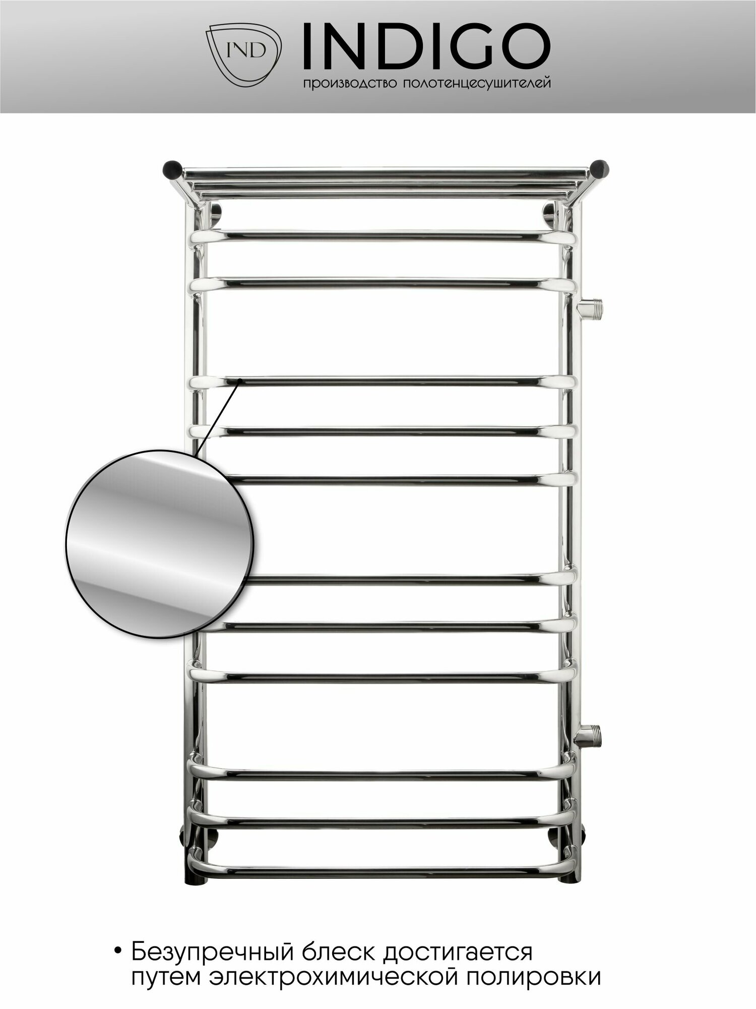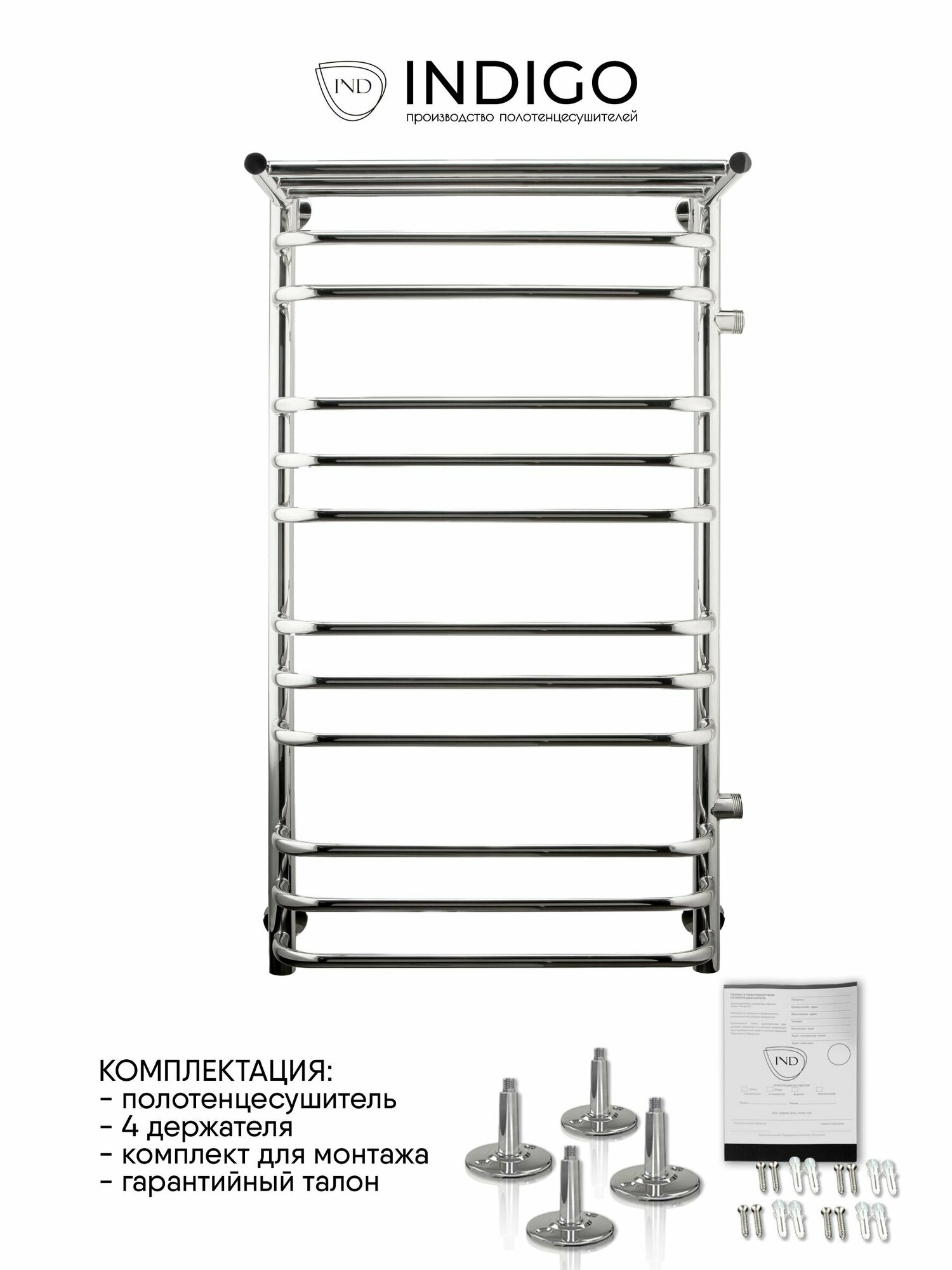Полотенцесушитель водяной INDIGO Brace с полкой с боковым подключением в размере 1000х500 (ВхШ) выбирают за его скобообразные перекладины и функциональность. Модель изготовлена из высококачественной нержавеющей стали. Качественная металлообработка в местах подключений обеспечивает плотное прилегание прокладки. Полотенцесушитель проходит тщательный этап полировки, поэтому обладает безупречным блеском. В комплектацию входит изделие, гарантийный талон, держатели 4 шт. Для монтажа необходимо отдельно приобрести нужные вам фитинги. Полотенцесушитель INDIGO Brace застрахован и имеет гарантию 5 лет. Выбирая INDIGO, вы получаете надежный продукт из нержавеющей стали с гарантией качества от Российского производителя.