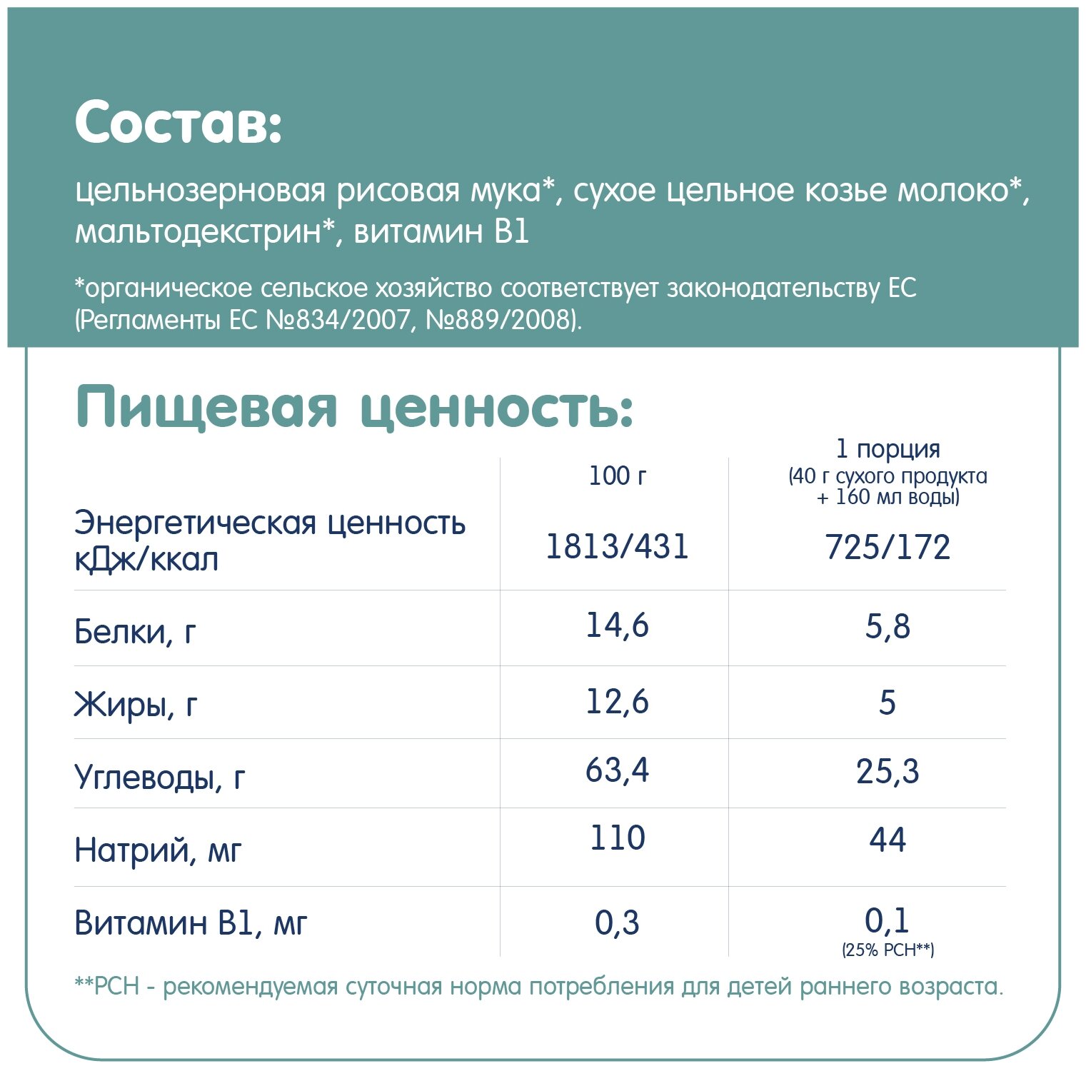 | Состав | цельнозерновая рисовая мука, сухое цельное козье молоко, мальтодекстрин, витамин В1 |