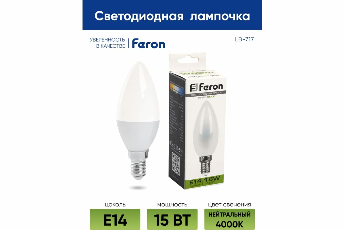 На сегодняшний день товар «Лампа светодиодная Feron E14 15W 4000K Свеча Матовая / 38257» можно купить с кешбеком в 1 магазине: Яндекс.Маркет