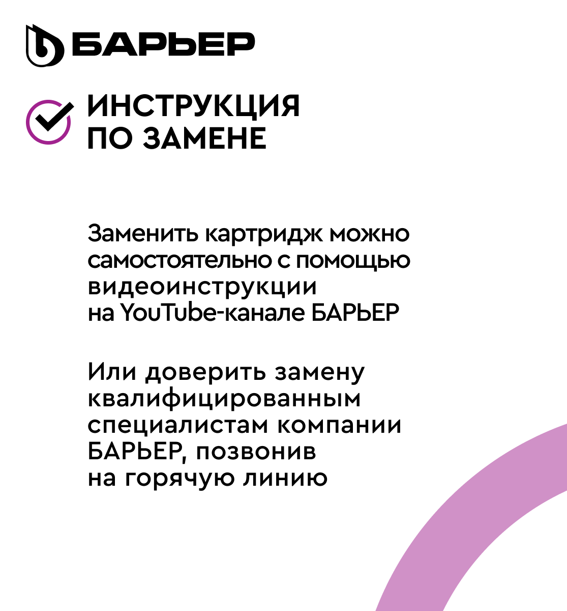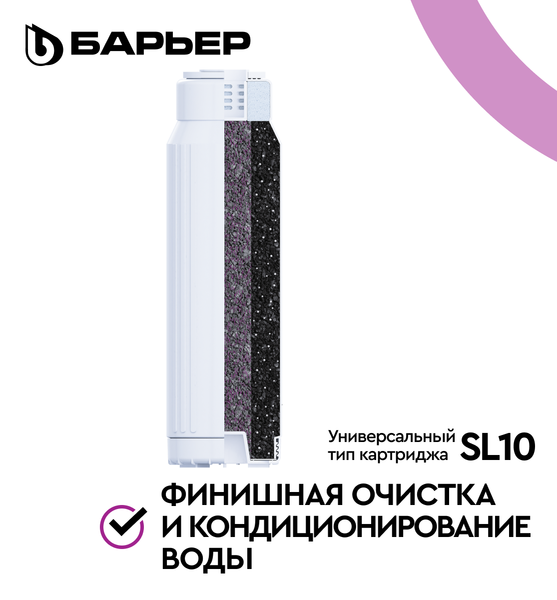 Фильтроэлемент "барьер " предназначен для финишной доочистки водопроводной воды, удаления тяжелых металлов, а также остаточных запахов и привкусов. Бактериостатические компоненты предотвращают размножение бактерий внутри проточного фильтра. Ступени очистки. Технология NanoPlus увеличивает сорбционную емкость компонентов фильтроэлемента. Фильтр тонкой очистки предотвращает попадание угольной пыли в очищенную воду. Кокосовый активированный уголь удаляет хлор и хлорорганику.