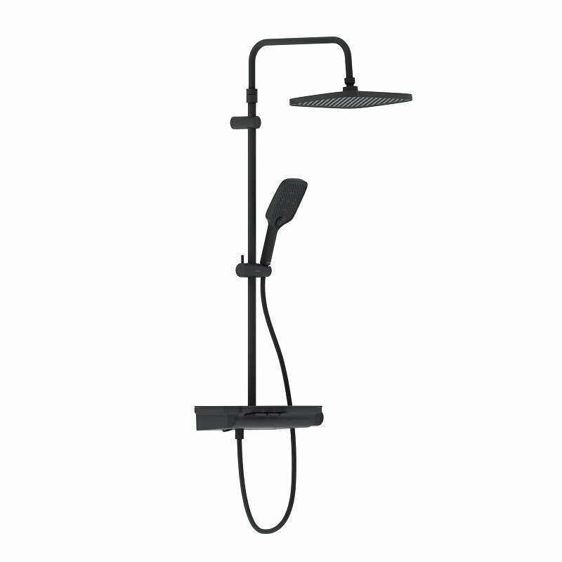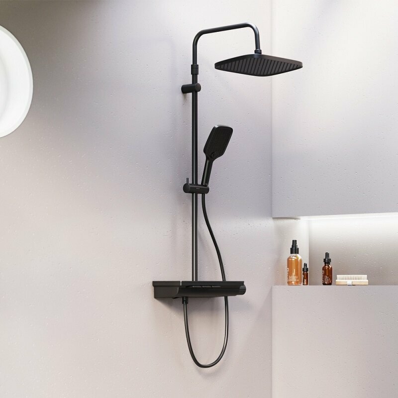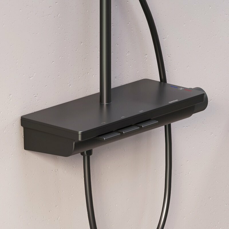 Душевая стойка Damixa . Мягкие геометричные формы трендовое черное покрытие и солидное датское качество идеальное сочетание для современной ванной комнаты. Простая и минималистичная на первый взгляд душевая система Gala чрезвычайно функциональна и удовлетворит даже самого искушенного пользователя. Максимальная безопасность: термостатический картридж 35 мм обеспечивает точную настройку температуры и напора воды. Благодаря телескопической штанге с диапазоном регулировки в 400 мм водные процедуры будут одинаково комфортны абсолютно для всех членов семьи. Непревзойдённый комфорт и удобство: благодаря стильной полочке из ударопрочного закаленного стекла вы можете хранить все необходимые вещи под рукой. Настоящее SPA прямо у вас дома: наслаждайтесь увеличенным размер тропической лейки с регулируемым углом наклона (220 мм) и 3-мя режимами ручного душа. Возможность включения 2-х или 3-х режимов одновременно сделает ваши ежедневные ритуалы незабываемыми. Простота и минимализм во всем: переключайте потоки воды между изливом ручной и тропической лейкой нажатием всего одной кнопки. Специальное PVD-покрытие гарантирует чрезвычайную прочность душевой системы. Матово-черная поверхность не выцветает с годами и устойчива к механическим повреждениям загрязнениям и отпечаткам пальцев.