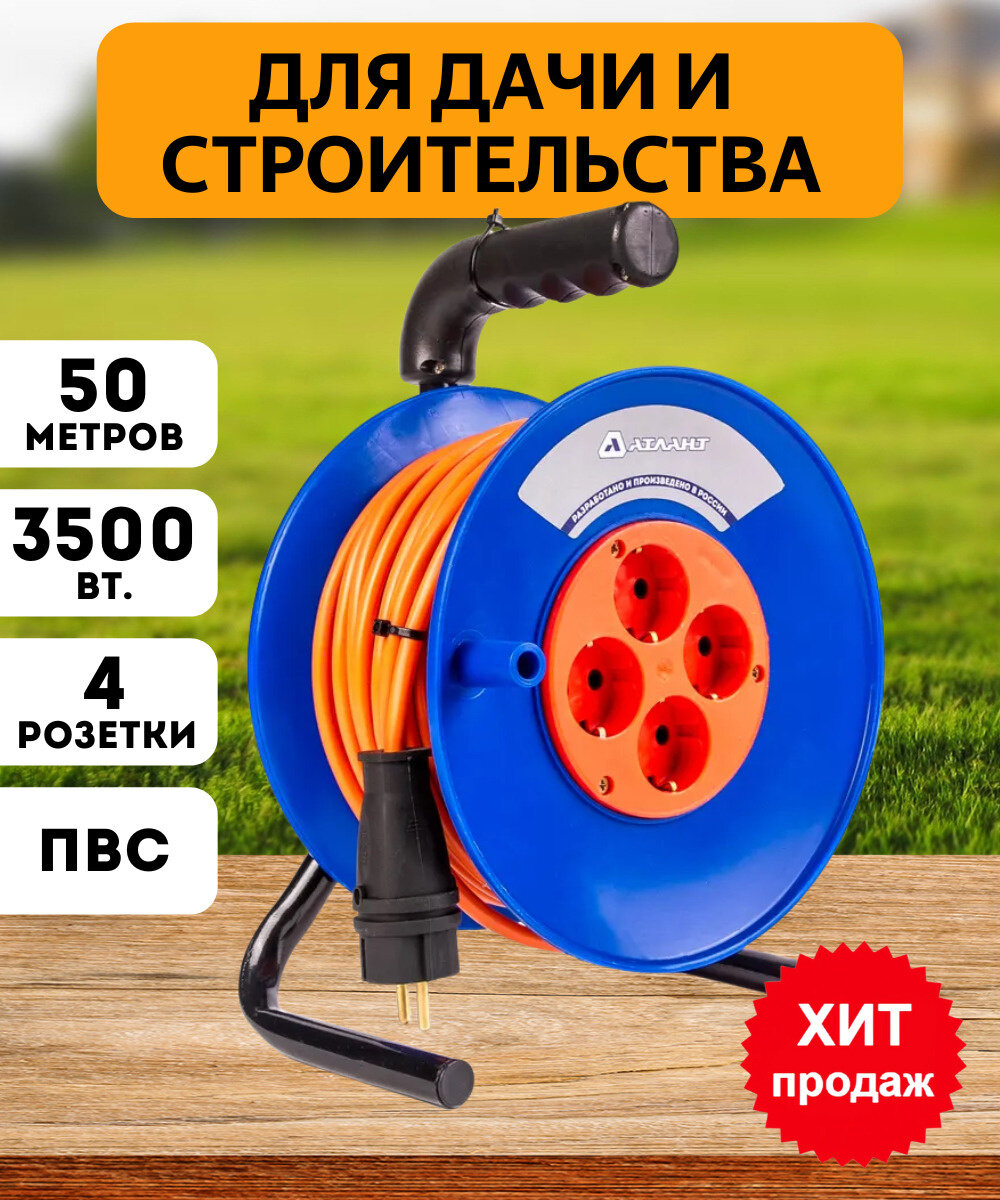 Удлинитель на катушке АТОМ ПВС 2x1,5 50м, представляет собой катушку из пластика, с четырьмя розетками имеющей диаметр 210мм с намотанным проводом - это удобное приспособление для защиты длинного провода от спутывания, его хранении и транспортировки. Удлинитель на катушке используется на строительных площадках, производственных цехах и в бытовых условиях, позволяет присоединить несколько электрических приборов одновременно, где осуществляется работа с электрическим оборудованием, находящимся на большом расстоянии от сети электропитания. На корпусе катушки располагается устойчивая подставка и специальная рукоятка для удобства переноски удлинителя.