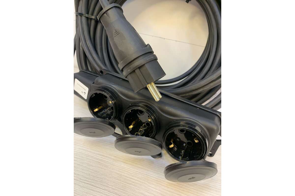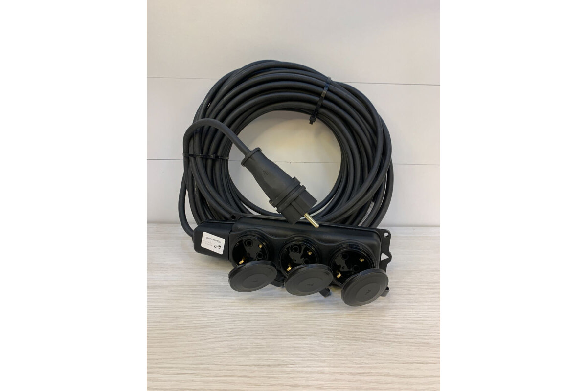 Удлинитель 3 розетки КГ 3х1,5 ГОСТ, 20 метров, имеет заземляющий контакт, высокую степень защиты (IP-44), гнездо обрезинено и оснащено защитной крышкой, вилка и розетка выполнены из каучука. Изделие подходит для использования в экстремальных условиях при температуре в диапазоне от +40 до -40 °С.