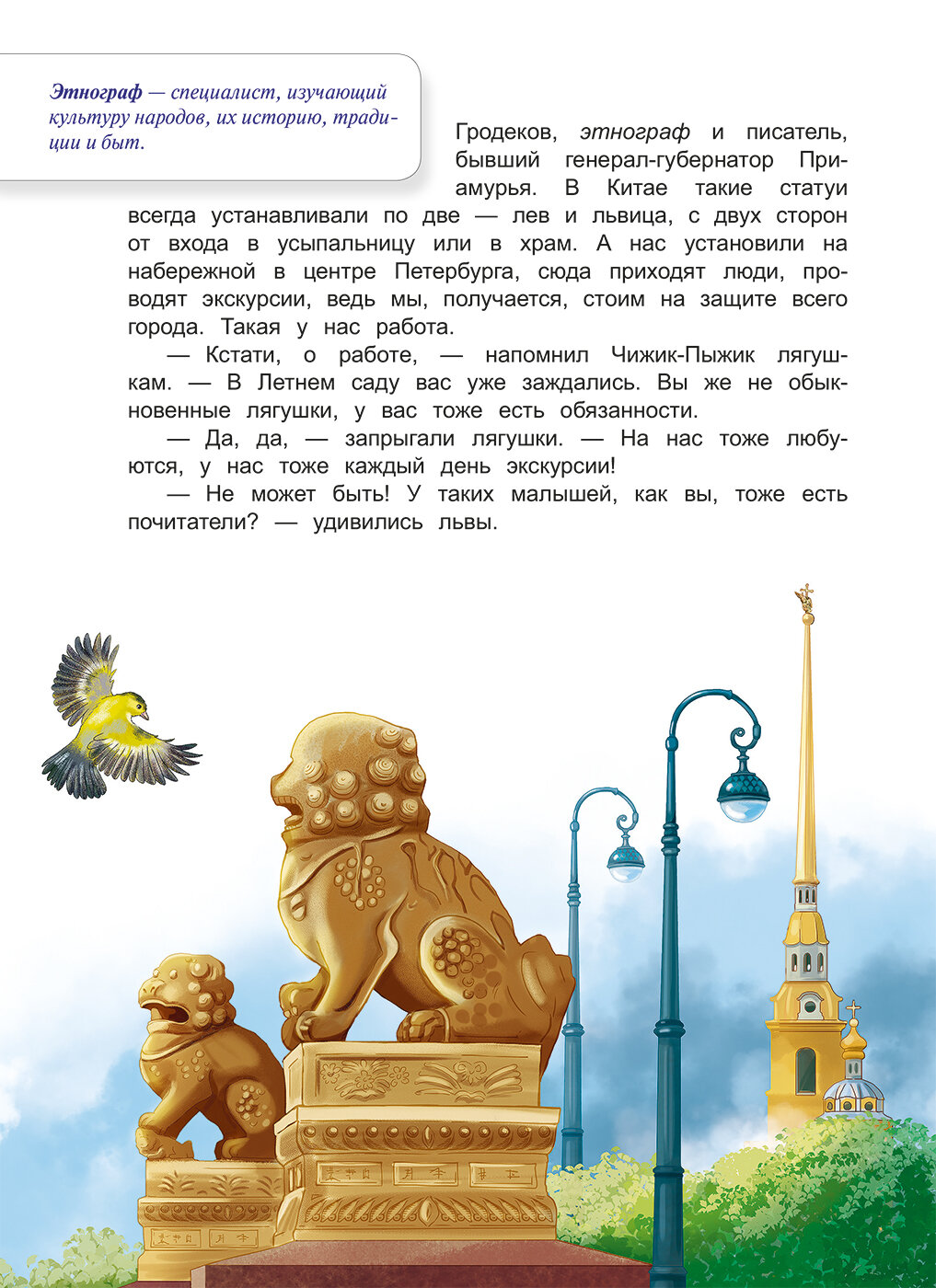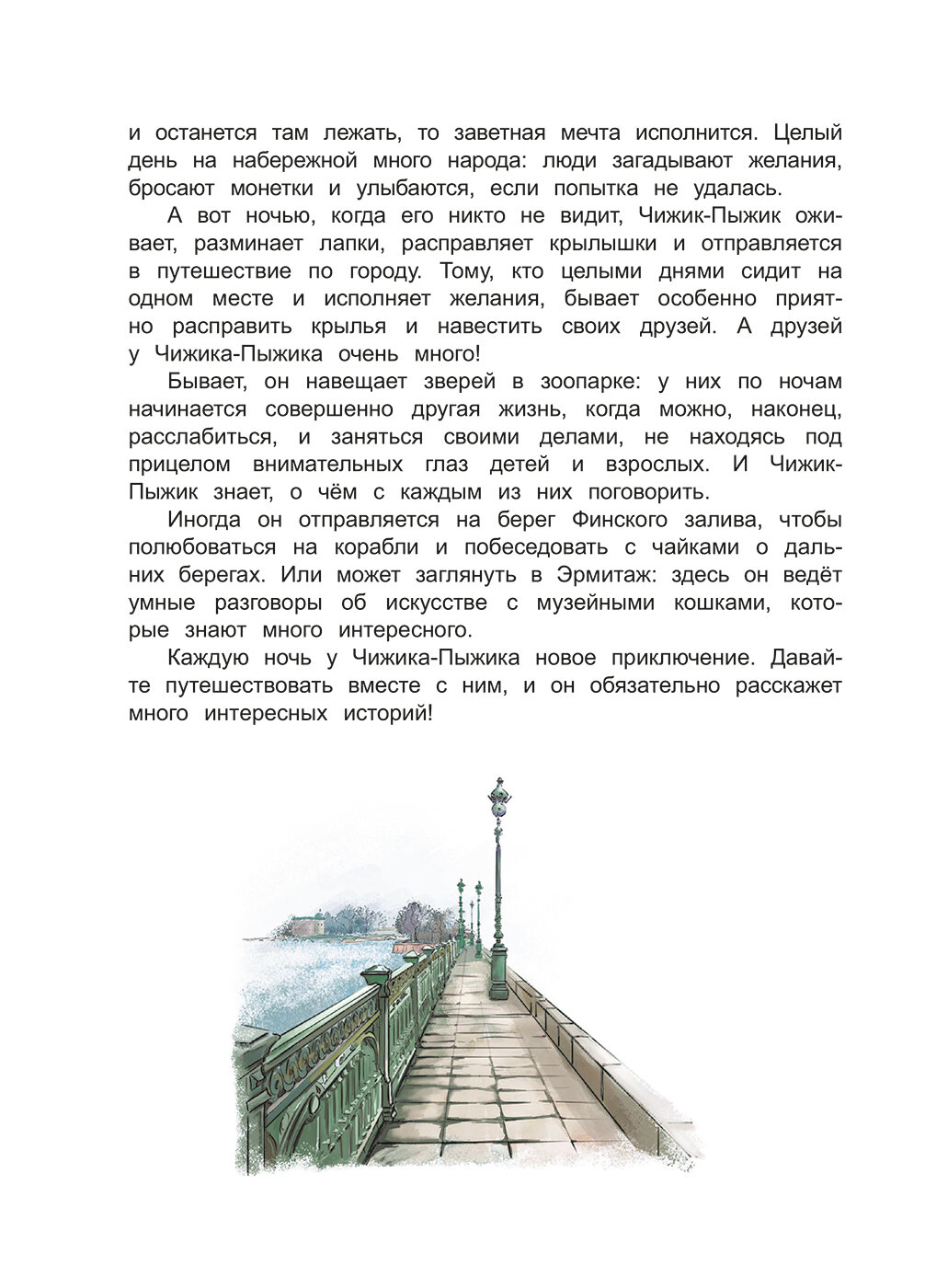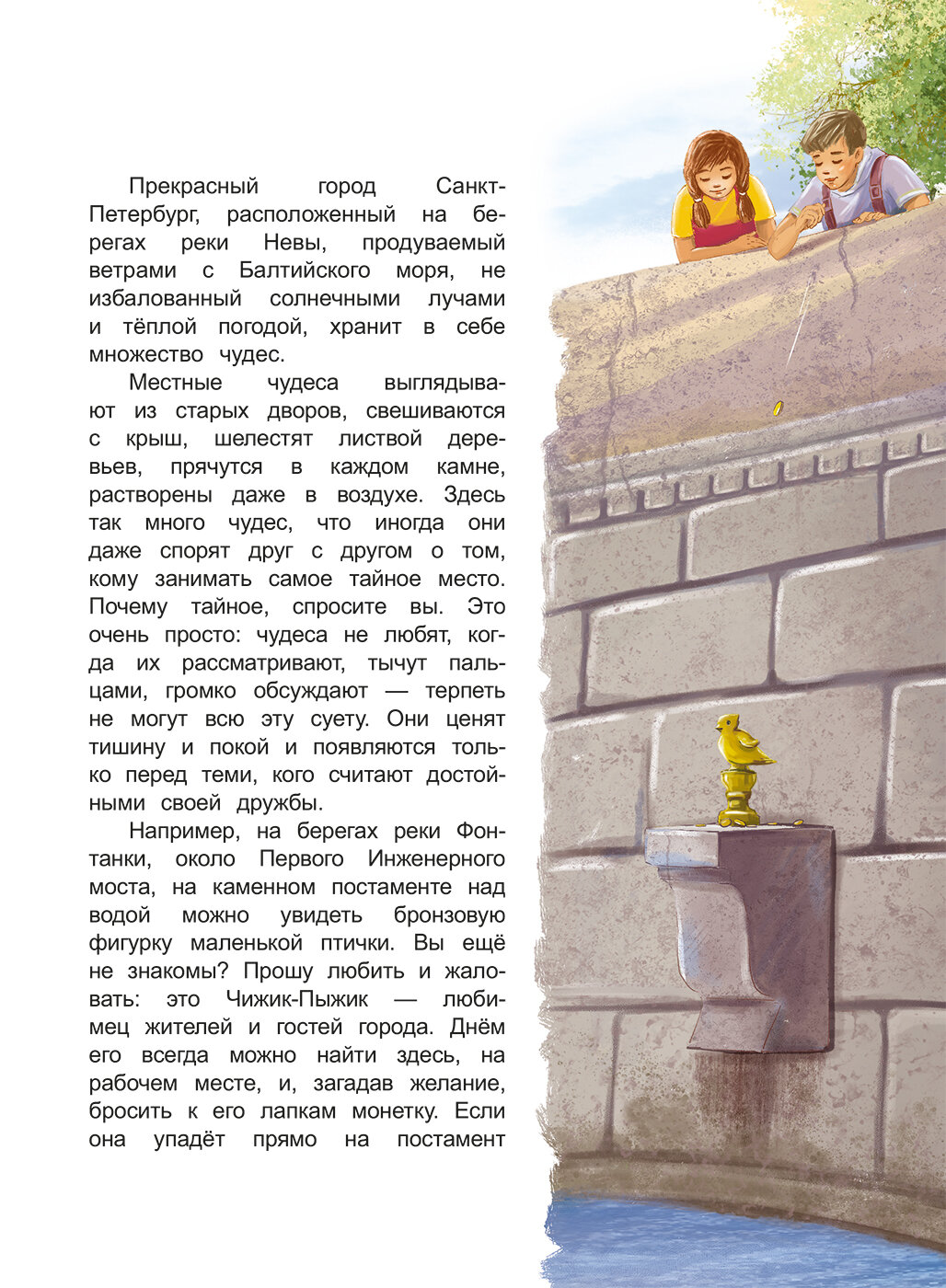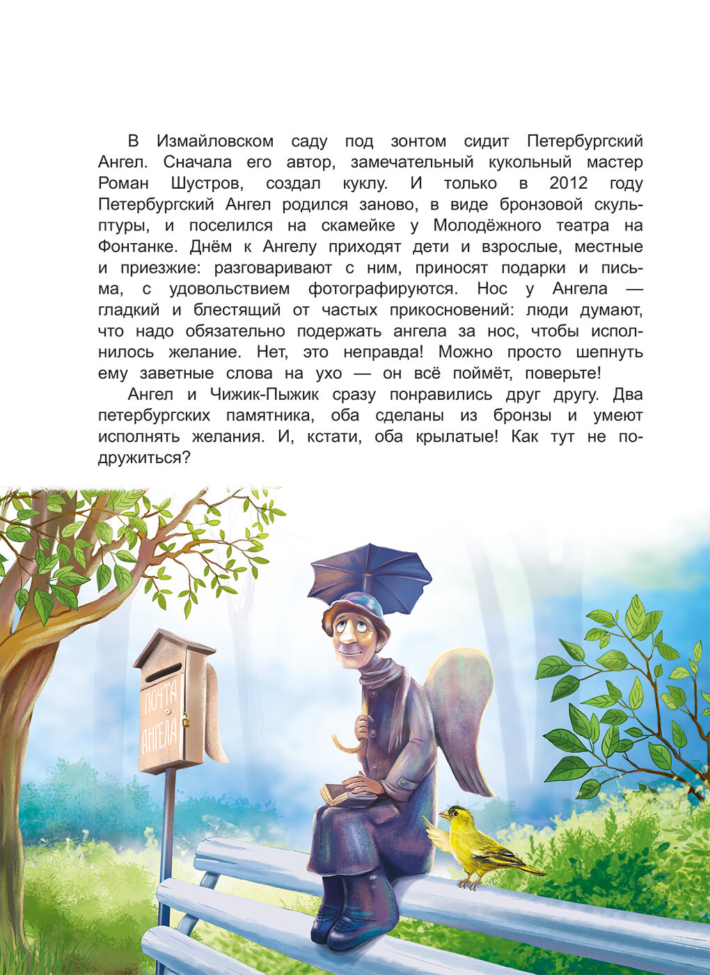 Неутомимый и любознательный Чижик-Пыжик приглашает вас в путешествие по Санкт-Петербургу. Вместе с ним вы познакомитесь с Петербургским Ангелом и другими хранителями города, прогуляетесь по Петропавловской крепости и раскроете загадку древнего манускрипта, среди тенистых аллей Летнего сада встретитесь с Иваном Андреевичем Крыловым и героями его басен, а также поучаствуете в настоящем детективном расследовании. И это только часть секретов Северной столицы, которые вам предстоит раскрыть на страницах этой книги.
