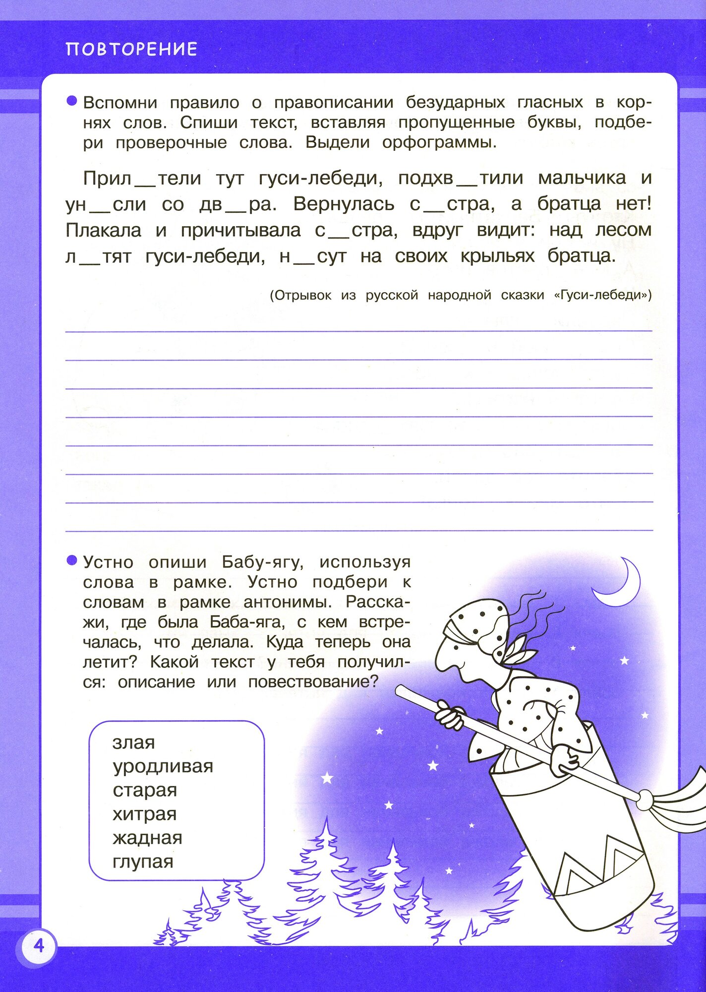 Эта книга адресована учащимся третьего класса. Она соответствует учебной программе и направлена на закрепление знаний, полученных на уроках русского языка. Книга предназначена для дополнительных занятий русским языком дома и на факультативных занятиях в школе. В пособии представлены задания, развивающие разговорные навыки, расширяющие активный словарь, задания на усвоение правил орфографии и пунктуации русского языка, задания на закрепление навыков звуко-буквенного анализа слов, задания на освоение морфемного состава слов, задания на изучение основ морфологии, а также ряд творческих заданий.