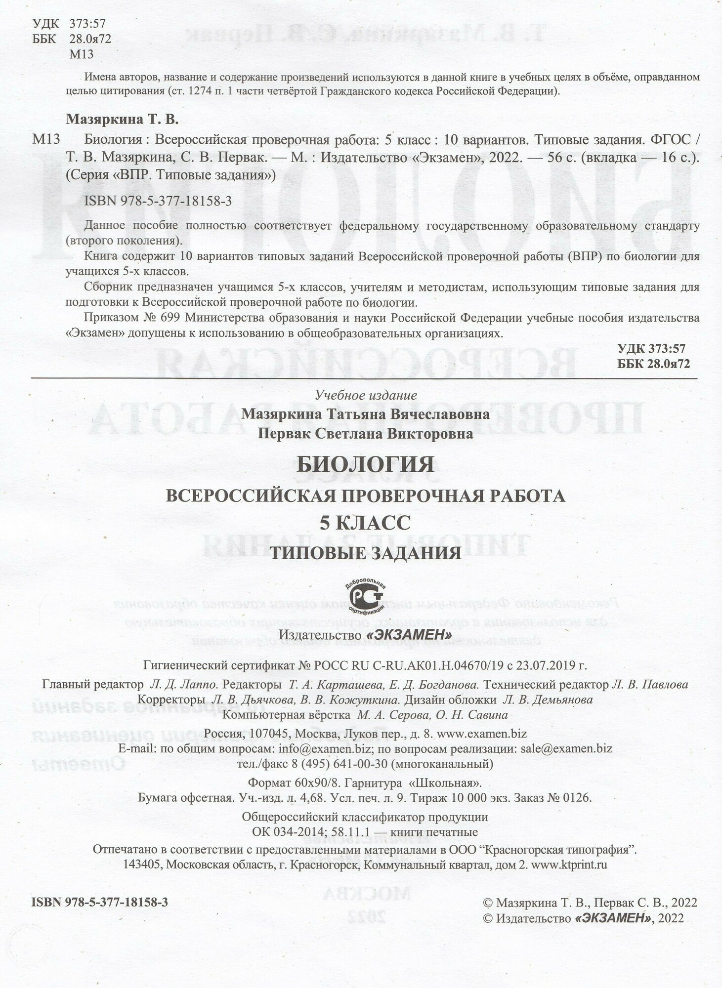 Биология. Всероссийская проверочная работа. 5 класс. Типовые задания. 10 вариантов заданий (Мазяркина Татьяна Вячеславовна; Первак Светлана Викторовна); Экзамен, 2022