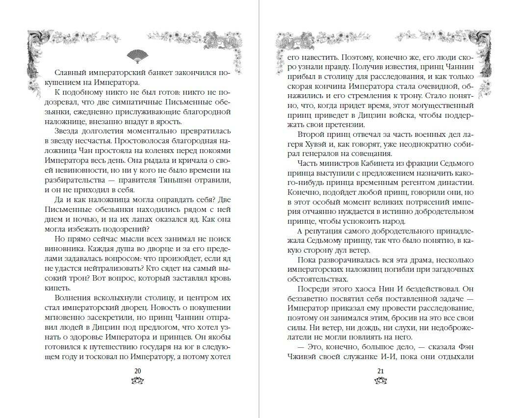 Я прям очень прониклась тематикой Древнего Китая. Потому что очень активно развернулась борьба за престол императора Китайской Империи. Сюжет насыщен событиями и интригами, происходящими во дворце. Еще особого внимания заслуживает и внешнее оформление этой книги, очень крутые иллюстрации. Любителям Древнего Китая рекомендую к прочтению эту книгу