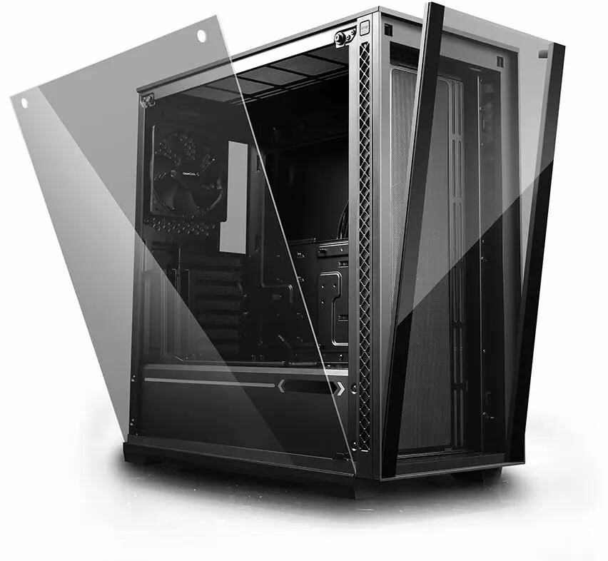 Корпус DEEPCOOL MATREXX 70 3F [DP-ATX-MATREXX70-BKG0P-3F] обращает на себя внимание наличием пары стеклянных панелей (боковой и фронтальной). Боковое окно отлично подходит для визуального контроля работы вентиляторов и оборудования, в оснащение которого входит подсветка. 0.6-миллиметровая сталь помогает гарантировать корпусу необходимую вибростойкость. Черный цвет модели придется по душе большинству пользователей. В настоящее время это типовое цветовое решение для компьютерных корпусов. Типоразмер корпуса DEEPCOOL MATREXX 70 3F [DP-ATX-MATREXX70-BKG0P-3F] – Midi-Tower. Форм-факторы совместимых плат – E-ATX, Micro-ATX, Mini-ITX и Standard-ATX. Корпус подходит для сборки высокопроизводительных компьютеров, в том числе – игровых. В последнем случае важным подспорьем может стать возможность установки видеокарт, длина которых может достигать впечатляющих 380 мм. Высота кулера процессора ограничена 170 мм.