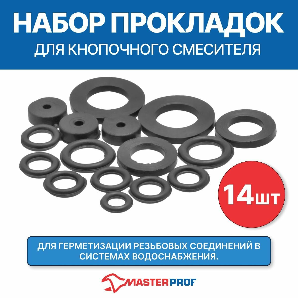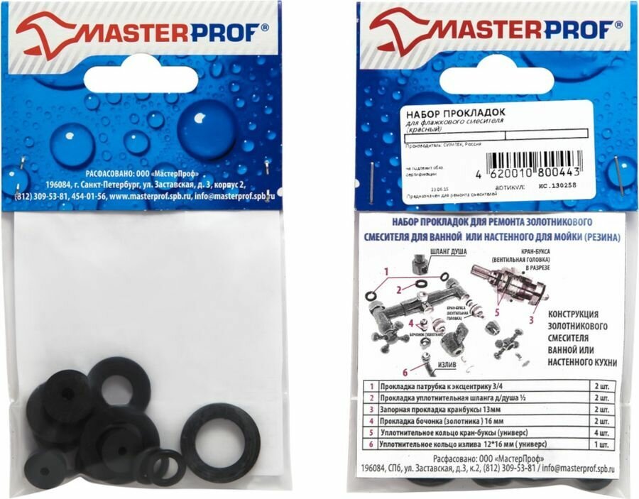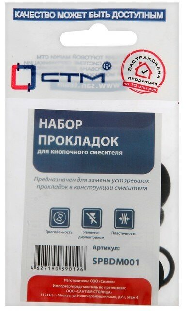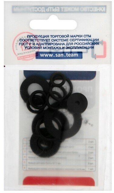 Данный набор прокладок предназначен для ремонта кнопочного смесителя (имеется ввиду смеситель с переключением с крана (дивертором) на душ кнопочного типа). Набор позволяет произвести замену всех прокладок смесителя. Подробная схема указана на обороте. Прокладки изготовлены из резины, благодаря чему имеют ряд преимуществ: обладают несущественным поглощением жидкости, а также повышенной устойчивостью к износу, непроводимостью электрической энергии и стойкостью к истиранию. Состав набора - Прокладка резиновая (для воды) 3/4" - 2 шт- Прокладка резиновая (для воды) 1/2" - 2 шт- Таблетка для кран-буксы 13 мм - 2 шт- Таблетка для кран-буксы отеч. 14 мм - 1 шт- Кольцо резиновое для кранбуксы 8х12 - 5шт- Кольцо резиновое для кранбуксы 6х10 - 1шт- Кольцо для отеч. излива 12х16 - 2шт
