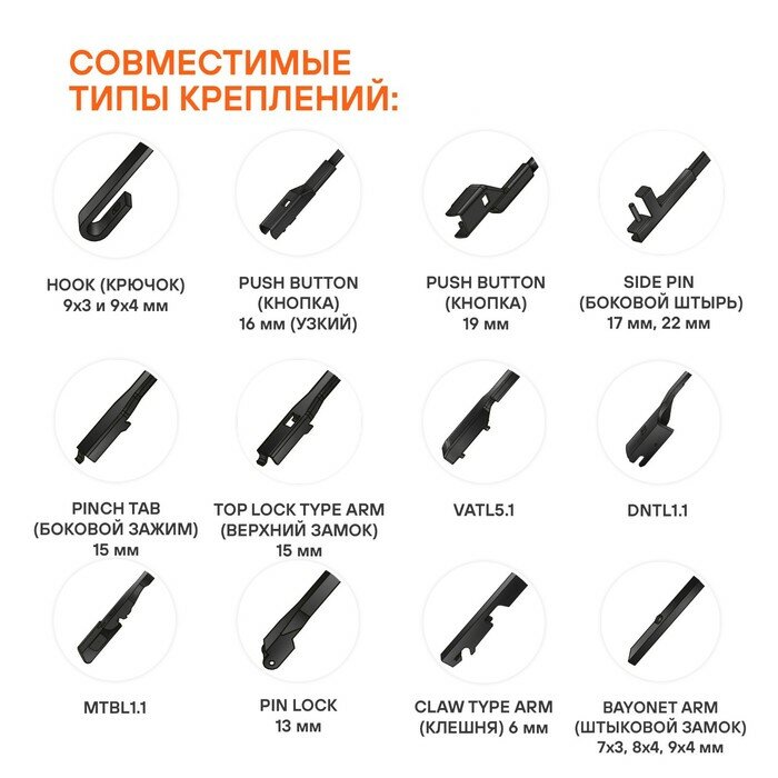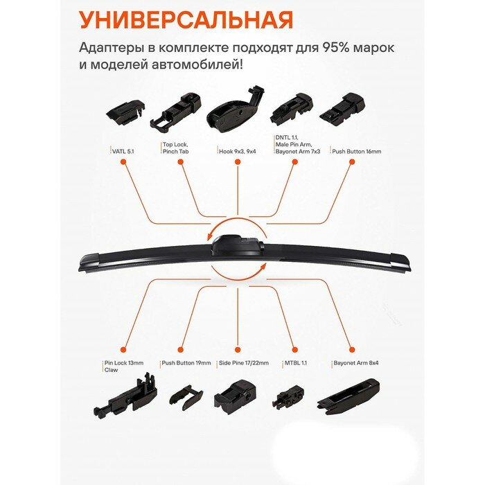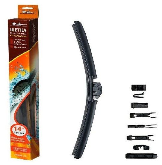 Щетка стеклоочистителя с бескаркасной конструкцией обладает рядом существенных преимуществ. К ним стоит отнести максимальную плотность прилегания щеток к стеклу, отличное аэродинамическое сопротивление, обеспечивающее бесшумное и быстрое скольжение изделия. За счет плотного прилегания к стеклу щетки способны очищать даже самые труднодоступные загрязнения. Особый состав резины препятствует старению и износу изделия. В комплекте к щетке прилагаются адаптеры, которые необходимы для установки на автомобили различных марок (подходя для 95% марок и моделей автомобилей). Типы адаптеров и инструкцию по их установке Вы можете скачать здесь