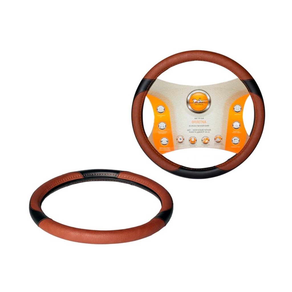 Оплетка на руль, искусственная кожа, коричневая/черная, 40 см / LОписание:Оплетка из искусственной кожи – это оригинальный аксессуар для автомобиля, а также надежная защита покрытия руля от потери цвета и появления дефектов различного плана. Основной цвет изделия – коричневый. По бокам и на нижней части оплетки имеются вставки черного цвета. Размер изделия L, а диаметр 40 см.Характеристики:Артикул: Цвет: коричневый/черныйРазмер: 40см/LФорма рулевого колеса: круг Комплектация: Оплетка-1 шт.Картонная вкладка-1 шт.Гарантия: от 1 года.