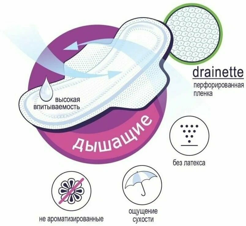 - Технология Drainette Air: быстрое впитывание, ощущение сухости и свежести до 8 часов;