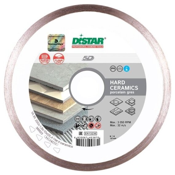 Круг алмазный 1A1R RS25T 300x2,0x10x25,4 (32) Hard ceramics подходит для больших станков и УШМ, предназначенных для строительных и декоративных работ. Благодаря алмазному слою и сплошной технологии его нанесения, инструмент легко входит в материал, не оставляя сколов в местах реза. НЕ подходит для такого материла как гранит, так как изнашивает его алмазное покрытия, тем самым ухудшая качество будущего реза. Работает такой круг по технологии мокрой резки, и благодаря системе охлаждения может непрерывно работать на протяжении 5-6 часов. Обеспечивает высокую скорость работы, не теряя при этом качество исполнения.
