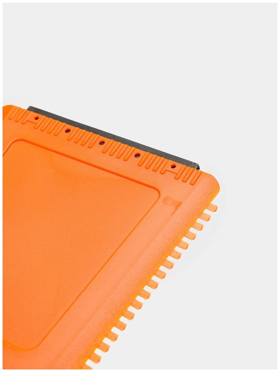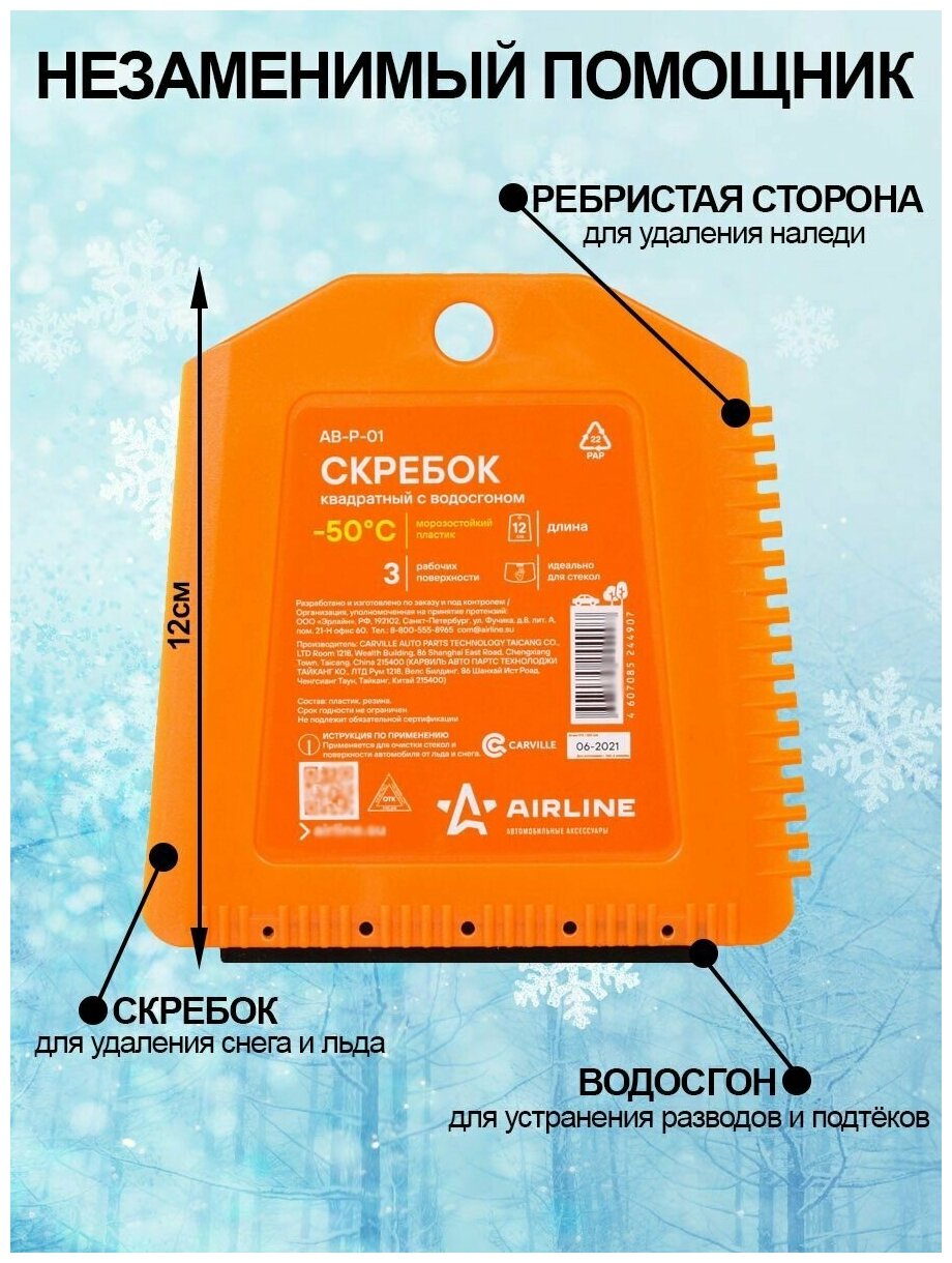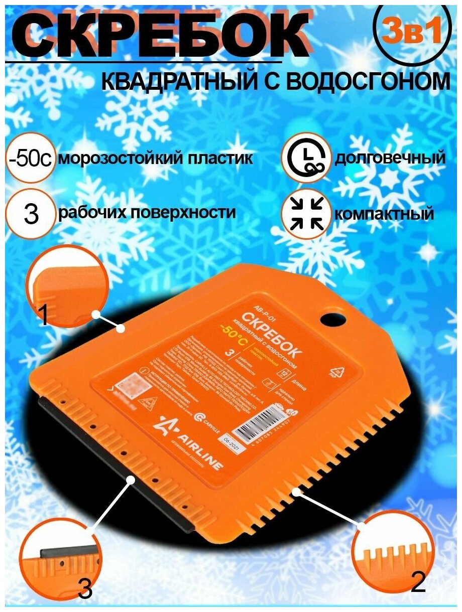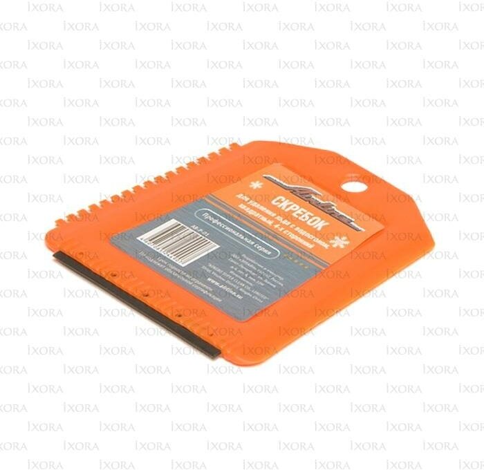 Скребок представляет собой изделие квадратной формы оранжевого цвета. На боковой и нижней части изделия расположены рабочие поверхности. Ребристая поверхность скребка позволяет удалить загрязнения или лед в сложно доступных местах, а водосгон устраняет разводы с корпуса автомобиля.
