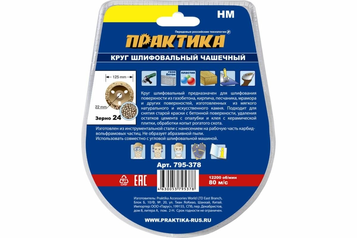 Чашка твердосплавная плоская ПРАКТИКА 795-378 предназначена для угловых шлифовальных машин. Применяется для шлифования поверхности из газобетона, кирпича, песчаника, мрамора и других поверхностей, изготовленных из мягкого натурального и искусственного камня. Подходит для снятия старой краски с бетонной поверхности, удаления остатков цемента с опалубки и клея с керамической плитки, обработки копыт рогатого скота.