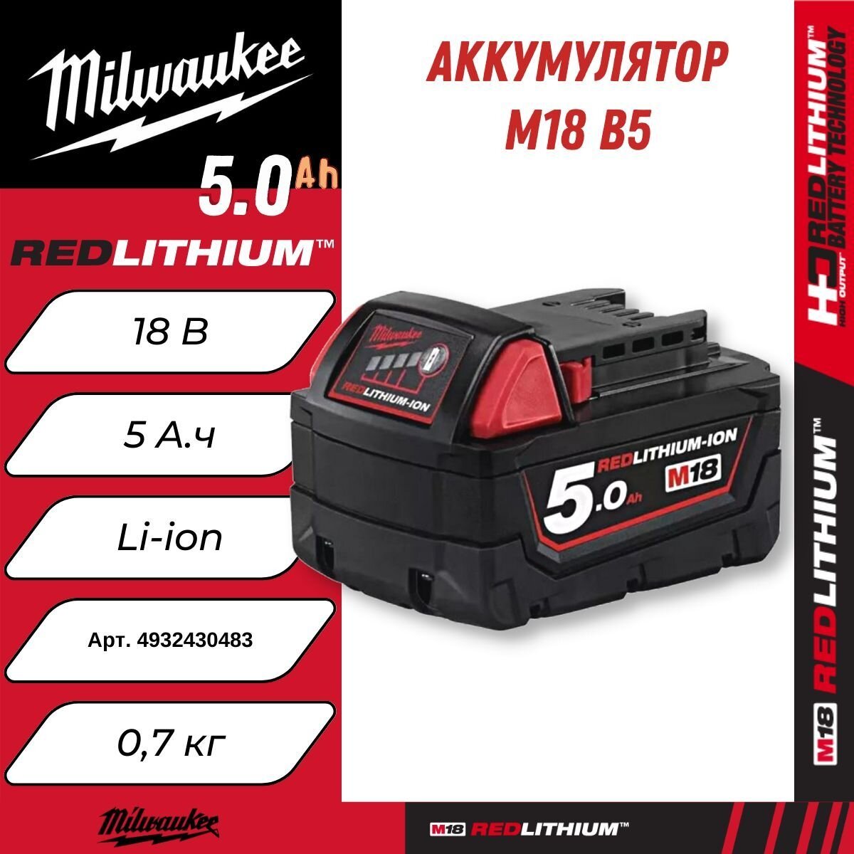 Аккумулятор Milwaukee M18 B5 5Ач Li-Ion 4932430483 M18, B5 Li-Ion, 5 Ач