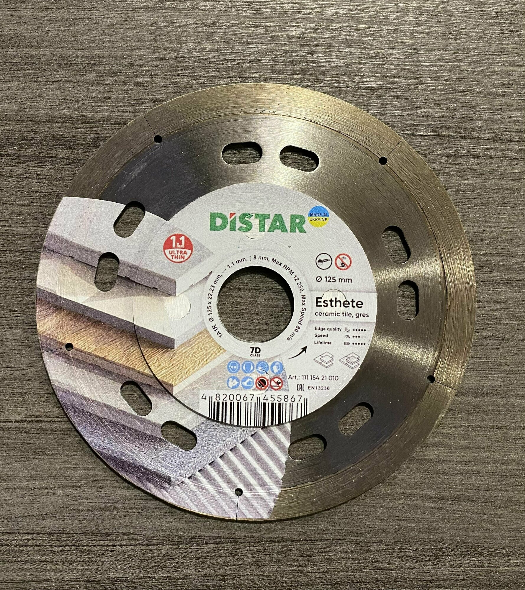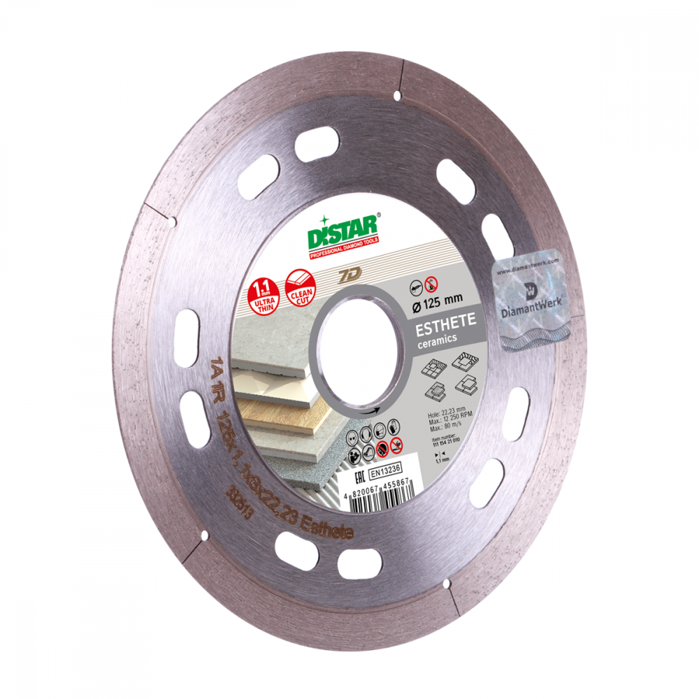 Диск алмазный сплошной Esthete DiStar 11115421009 предназначен для угловых шлифовальных машин. Применяется для резки керамической плитки с декоративным покрытием. Диск обеспечивает точный, аккуратный рез. Корпус диска усилен фланцами. Высота алмазного слоя – 8 мм.