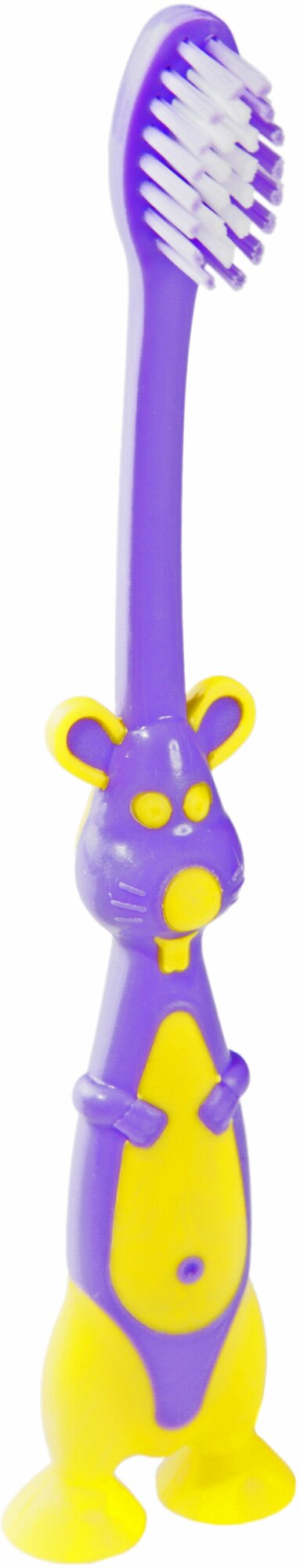 Детская зубная щетка с присосками с размером головки и щетины адаптированной под возрастные особенности ребенка. Действие - Специальная форма щетки позволяет ухаживать за молочными и первыми коренными зубами. Фигурка персонажей в качестве ручки щетки повышает интерес к процедуре чистки зубов. Фиксаторы (присоски) позволяют удобно располагать зубную щетку на поверхности. Жесткость щетины: мягкая Материал щетины: найлон 406 Материал ручки: полистирол, ТПР. Гамма зубной щётки состоит из 4 цветов. Зубные щётки доставляются на склад в закрытой коробке от производителя. Мы не можем повлиять на цвет зубной щётки в заказе. Поэтому цвет зубной щётки идёт рандомно! Имеет скребок для языка, обеспечивая гигиену полости рта и свежее дыхание при ежедневной чистке. Если вы пробовали аналогичные детские зубные щетки других производителей - курапрокс (curaprox), revyline, splat (сплат), r.o.c.s. (рокс), president (президент), или colgate (колгейт) для детей 0-3 и 3-6, то нам будет интересно Ваши ощущения в сравнении.