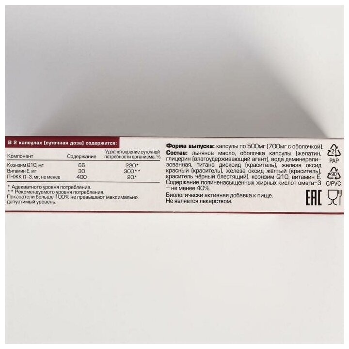 | Состав | Коэнзим Q10- 33мг, витамин Е - 15мг, масло льняное. |